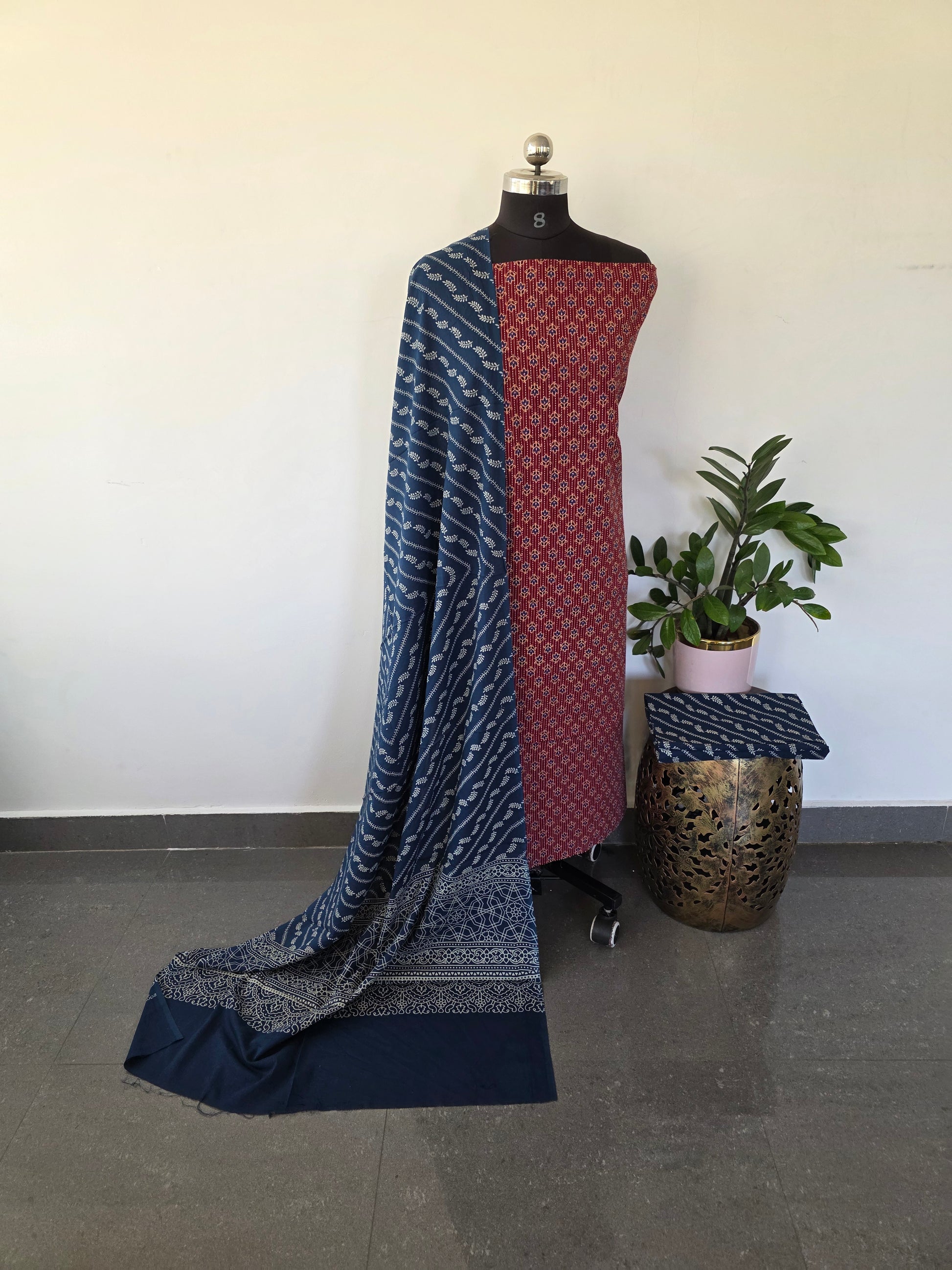 Handcrafted ajrakh-printed cotton ensemble featuring a generous 2.5-meter top in heavyweight ajrakh cotton, paired with pure cotton bottom and matching dupatta. This three-piece set showcases traditional block-print artistry on premium natural fibers, ideal for those seeking authentic handloom craftsmanship with versatile styling potential.
