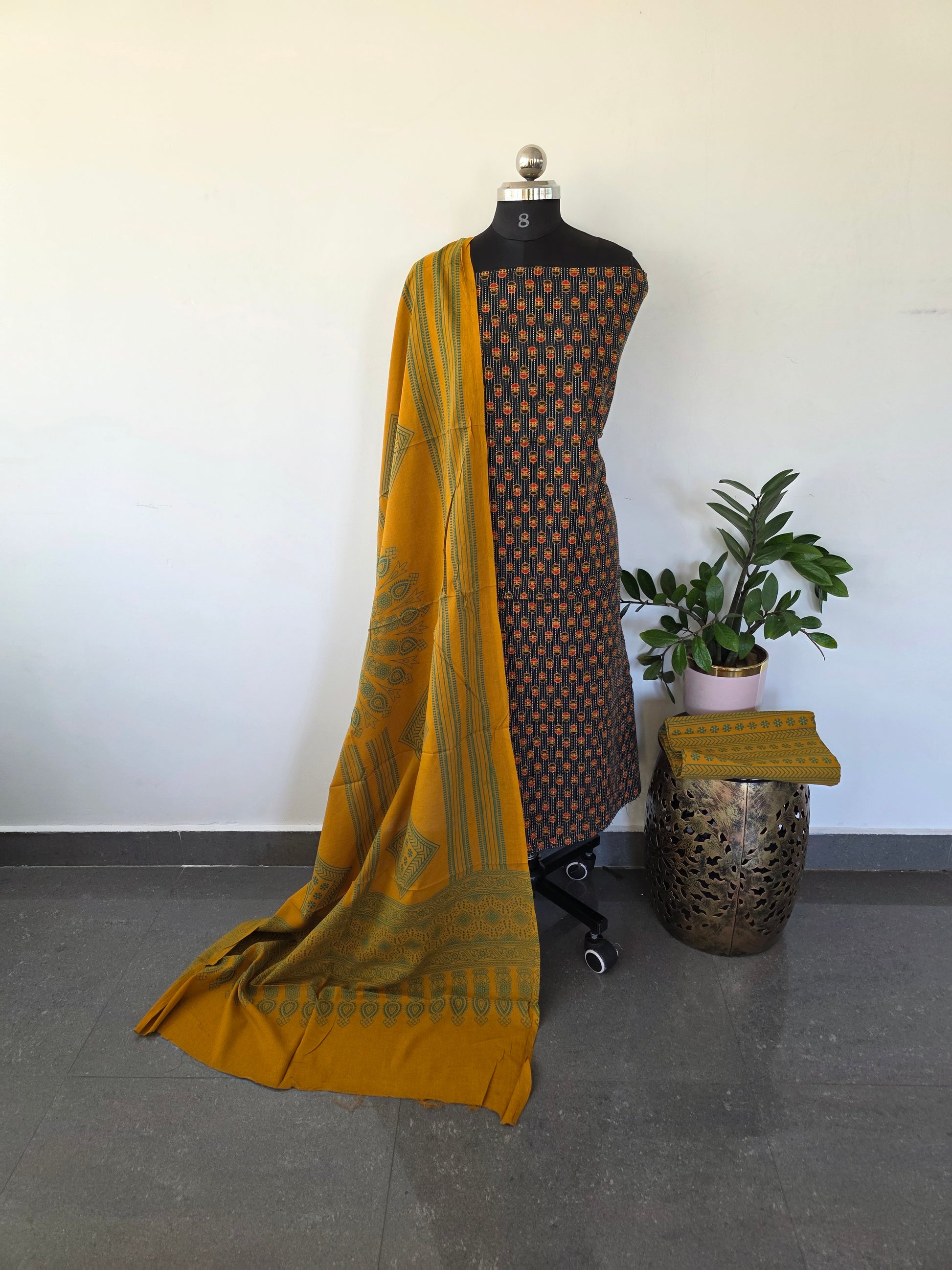 Handcrafted ajrakh-printed cotton ensemble featuring a generous 2.5-meter top in heavyweight ajrakh cotton, paired with pure cotton bottom and matching dupatta. This three-piece set showcases traditional block-print artistry on premium natural fibers, ideal for those seeking authentic handloom craftsmanship with versatile styling potential.