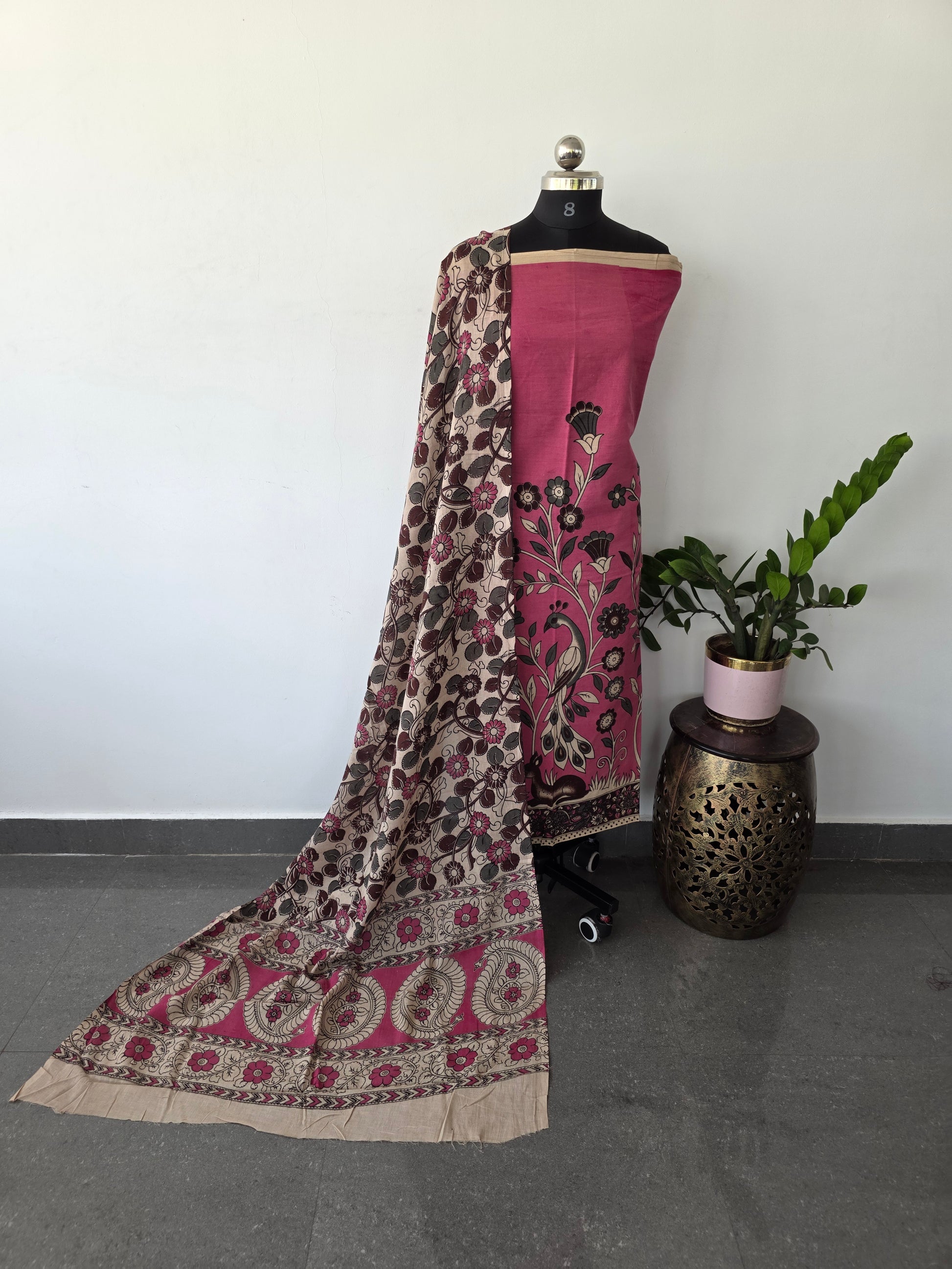 This authentic kalamkari cotton ensemble features a hand-painted top in pure cotton with 2.50 meters of fabric, paired with a coordinating dupatta measuring 2.25 meters. The set arrives unstitched, allowing you to customize the fit and silhouette to your preferences. Ideal for those who appreciate traditional textile artistry and the versatility of handloom pieces.