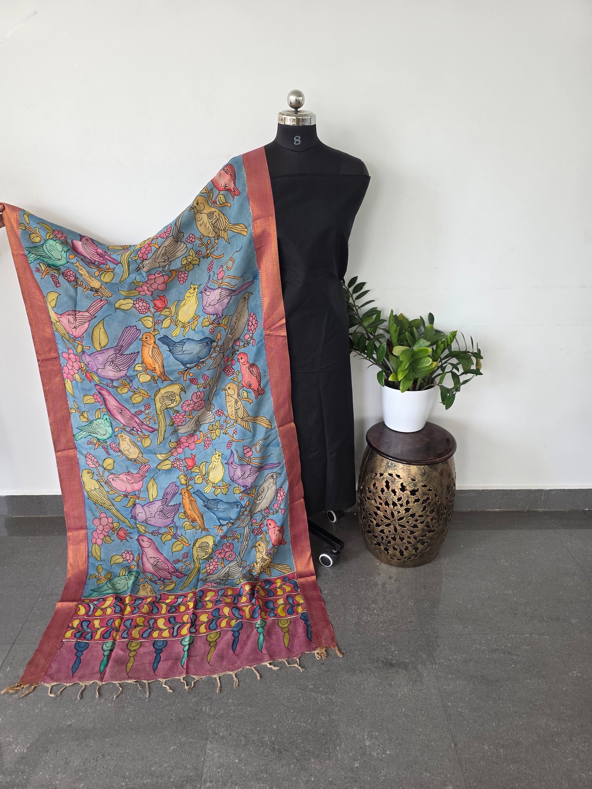 These authentic pure pen Kalamkari silk duppattas, made from high-quality silk with a distinctive Nizam border, are exquisite handcrafted pieces. Each duppatta is a unique work of art that narrates a story, representing a carefully crafted, timeless legacy of our cultural heritage.