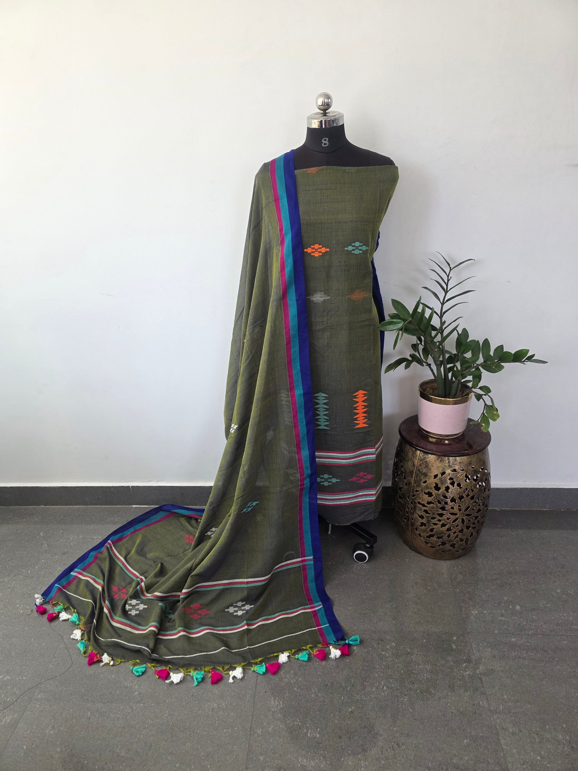 Handwoven Bhujodi embroidery adorns this two-piece ensemble crafted from pure khadi cotton. The unstitched top features 2.5 meters of fabric with intricate traditional detailing, paired with a coordinating dupatta embellished with matching Bhujodi work and finished tassels. Bottom not included—designed for the discerning weaver to complete their ensemble.