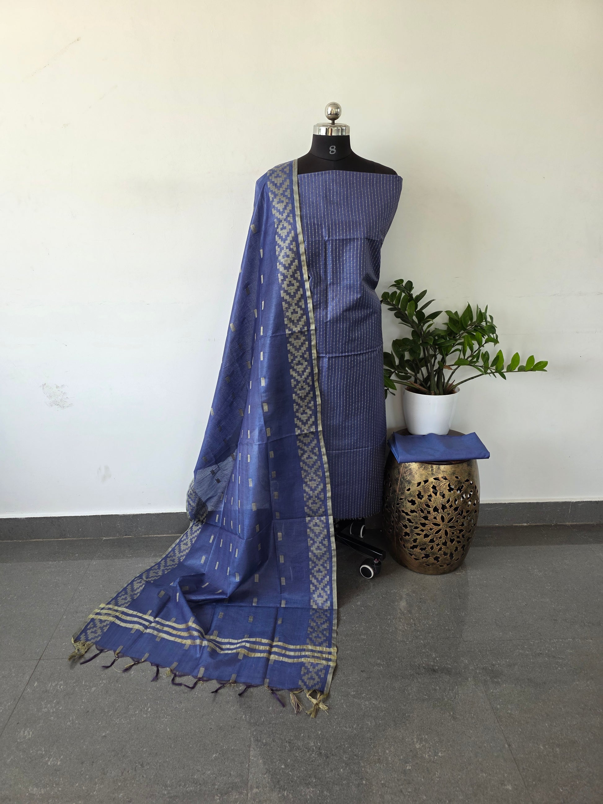 Bhagalpuri soft silk top featuring intricate thread weaving, paired with a soft silk dupatta adorned with delicate tassels. The ensemble highlights the rich texture and elegance of Bhagalpuri silk fabric.