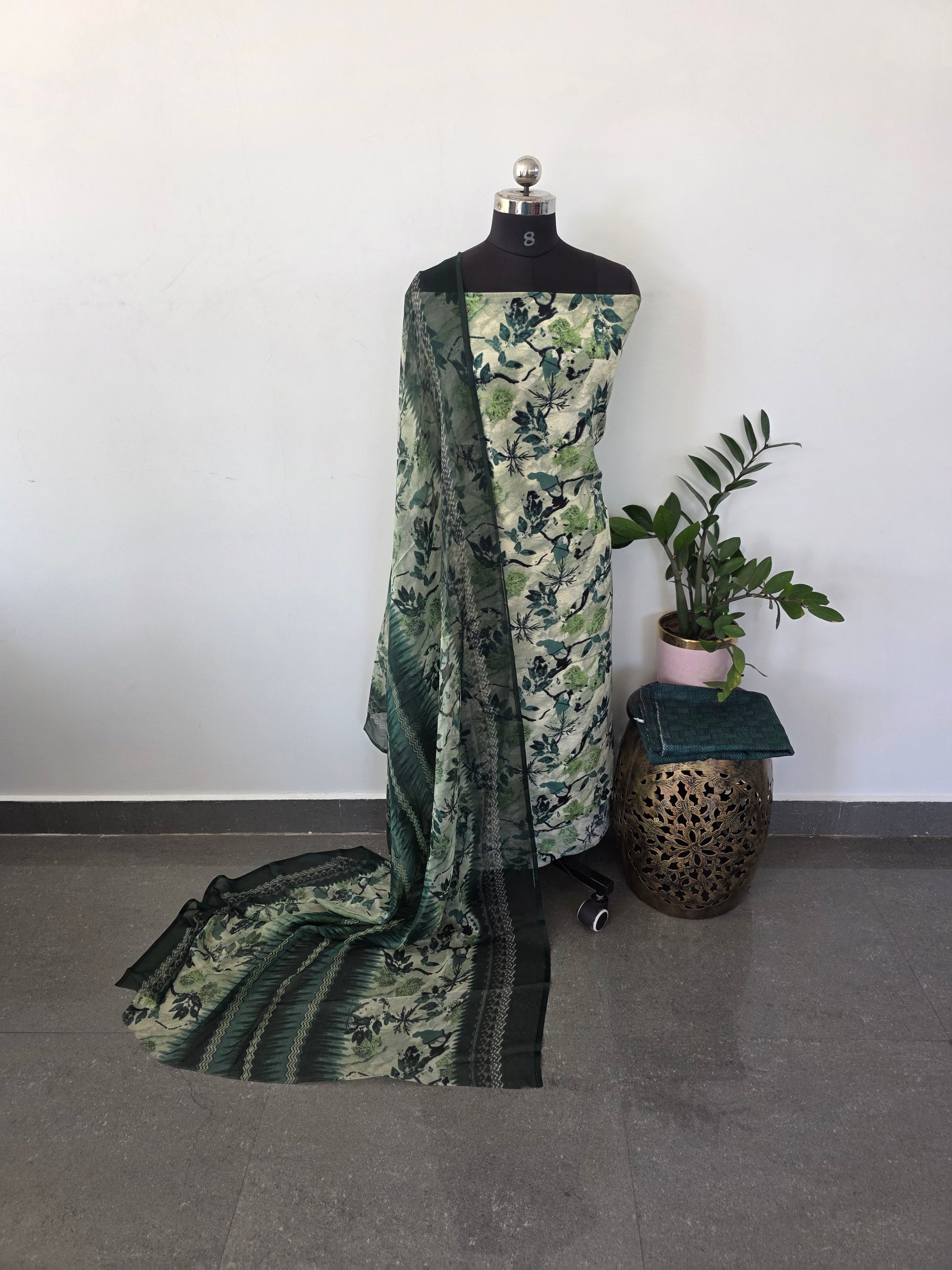 This set includes a premium French crepe top measuring approximately 2.40 meters, paired with a bottom and dupatta each about 2.25 meters in length.