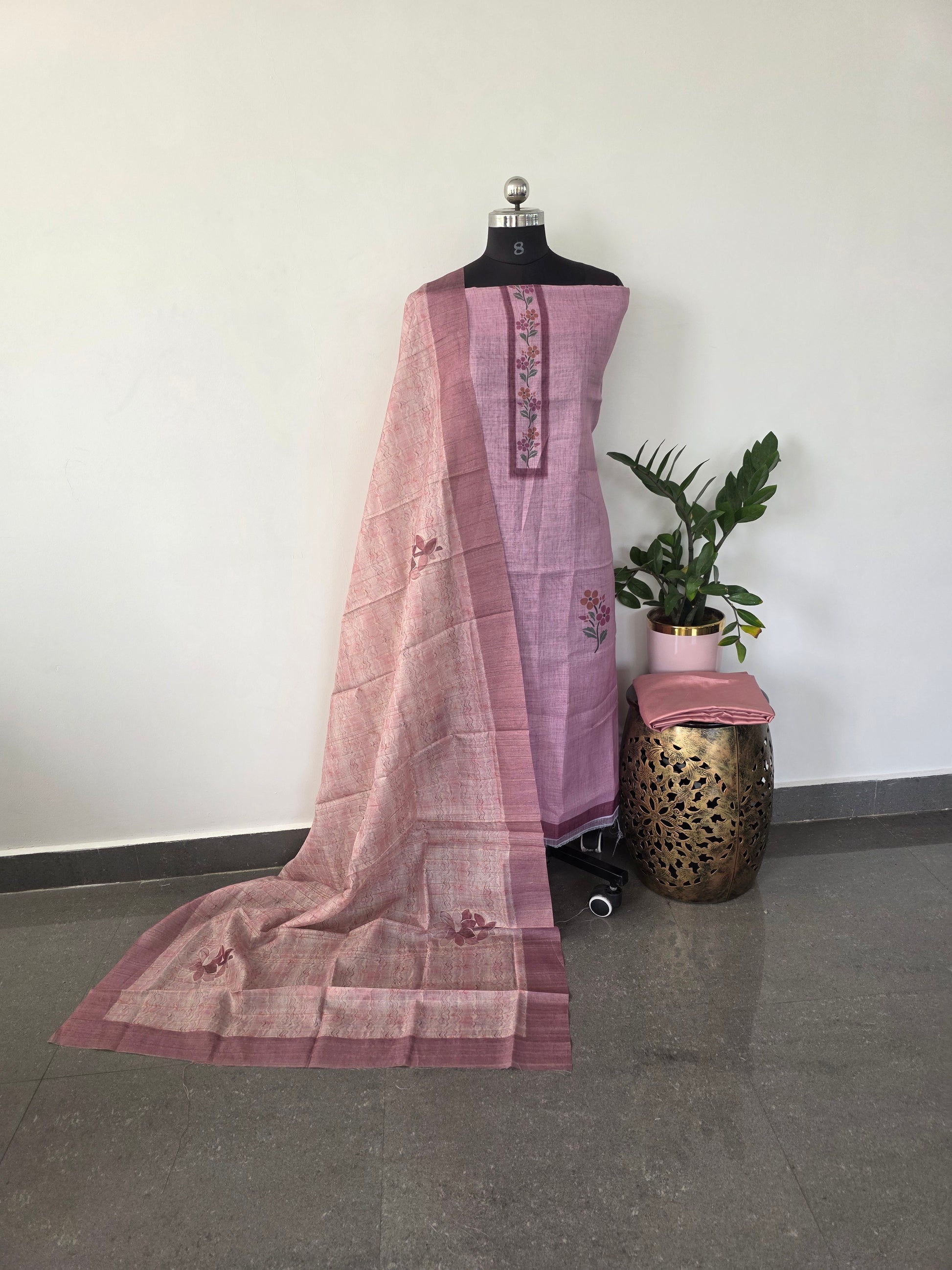 Elevate your ethnic wardrobe with this sophisticated three-piece ensemble. The breathable linen top pairs seamlessly with a luxurious silk bottom, while the tussar duppatta adds refined texture and movement. Perfect for occasions demanding understated elegance and natural comfort.