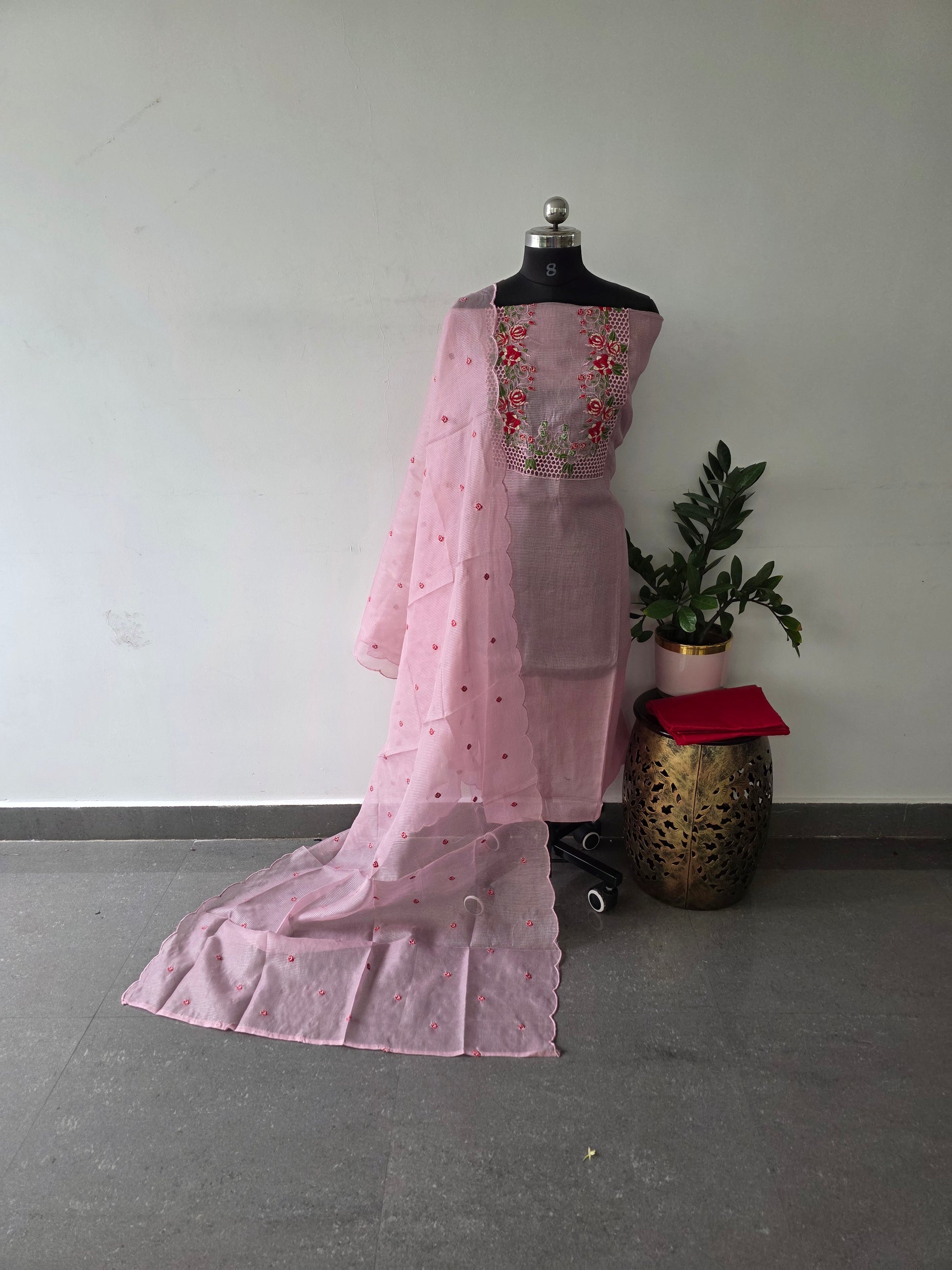 Elevate your wardrobe with this sophisticated ensemble featuring a premium organza top adorned with intricate embroidery and delicate cutwork detailing at the yoke and hemline. Paired with a luxurious silk duppatta and a matching organza shawl, both finished with refined embroidery, cutwork accents, and an elegant scalloped border. A masterfully crafted piece that celebrates traditional artistry with contemporary elegance.