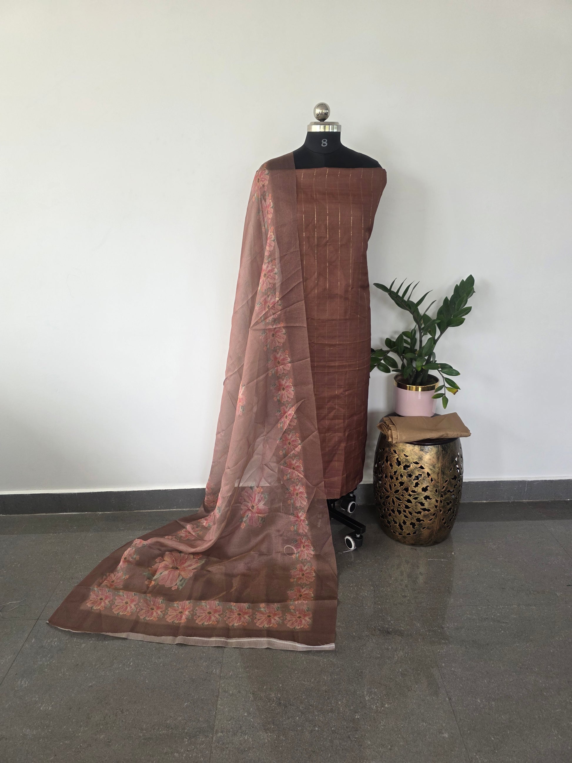 A curated three-piece collection that brings together tussar silk craftsmanship with pure silk construction. The top and dupatta showcase tussar's characteristic luminosity and texture, while the silk bottom provides graceful movement and comfort. Designed for discerning wearers who appreciate the interplay of natural fibers and their distinct aesthetic qualities, this set delivers understated elegance for special occasions and formal gatherings.