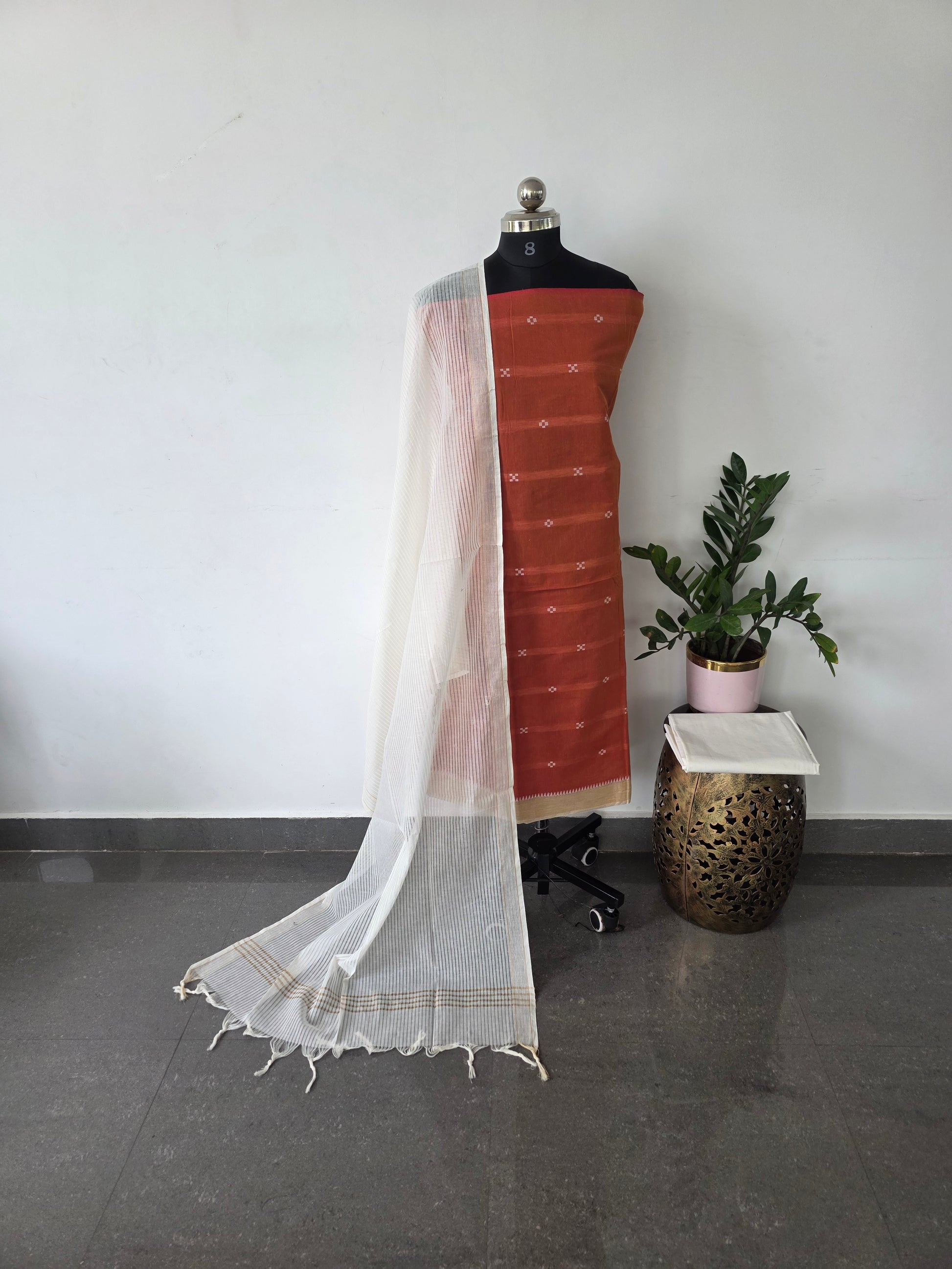 This set features a pure cotton top adorned with a jacquard weave and a 2.5-meter temple border. The bottom is crafted from 2 meters of pure cotton fabric. Completing the ensemble is a 2.25-meter pure cotton shawl with elegant tassels.