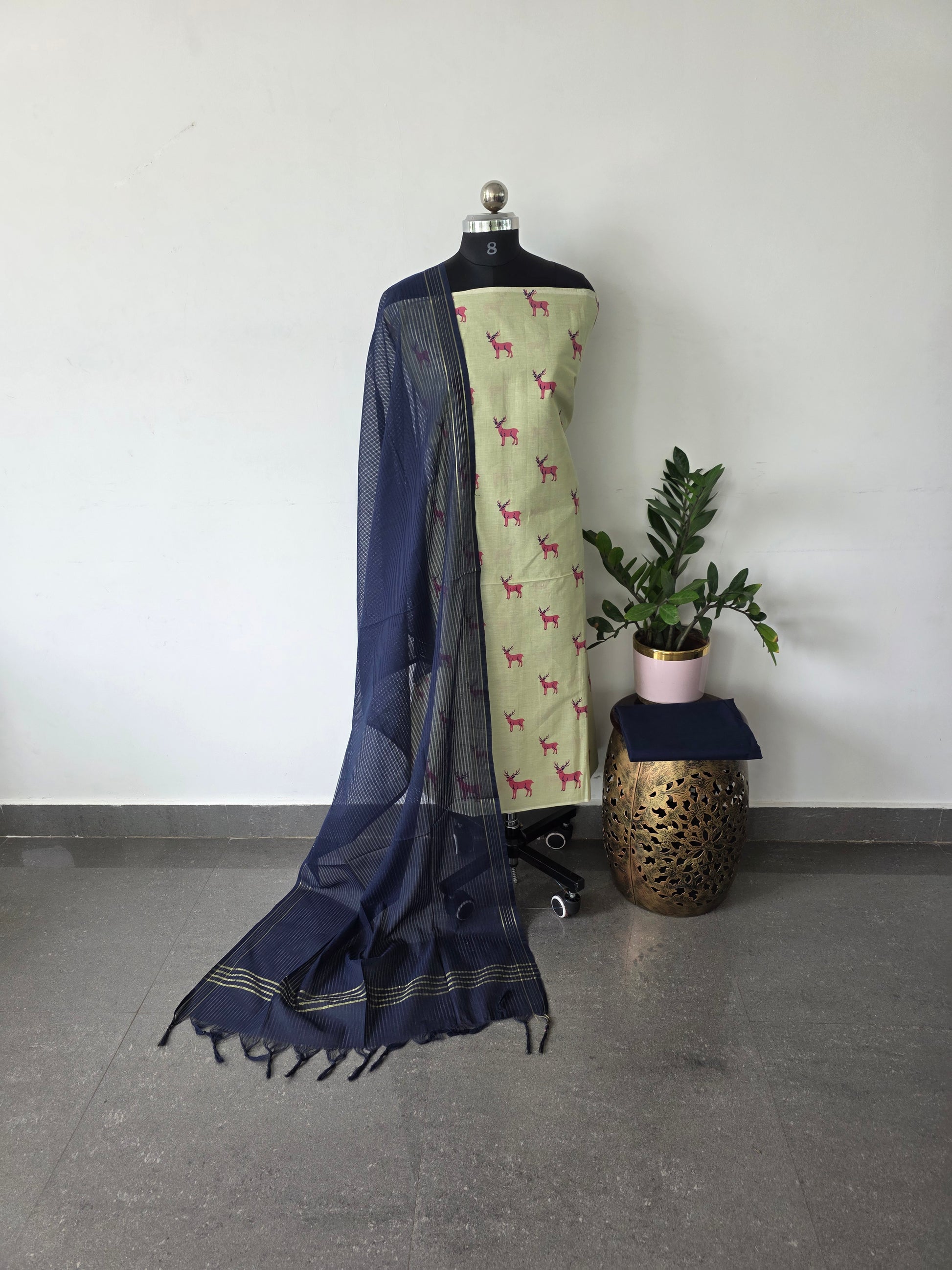 This set features a pure handloom cotton top adorned with traditional Warli prints, paired with a cotton bottom. The ensemble is completed by a pure cotton dupatta, enhanced with an elegant zari border and delicate tassels.