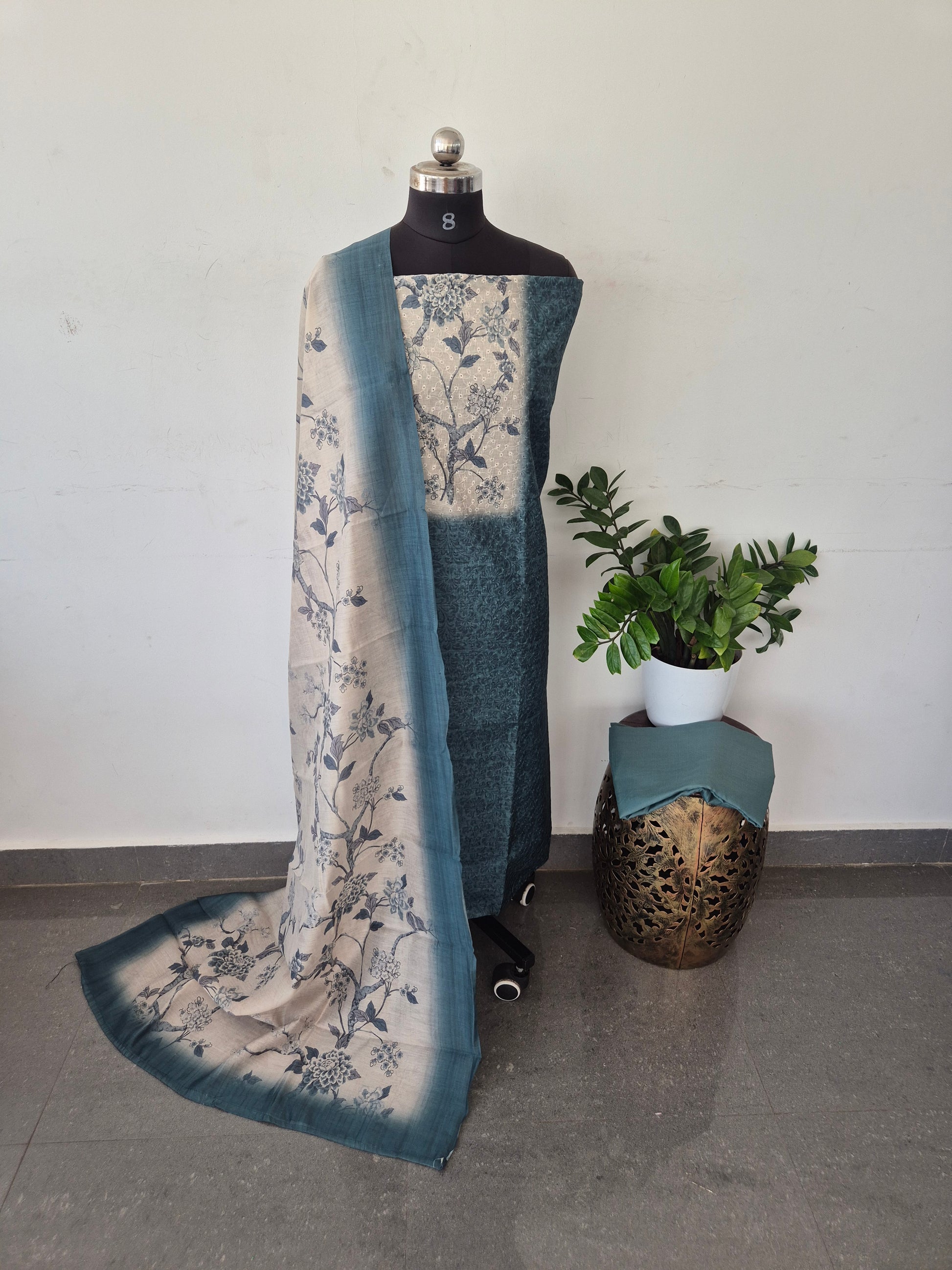The top is crafted from Hakoba silk, featuring intricate kantha stitching on the neck patch and the adjacent patch. The bottom is made of silk, complemented by a pure chiffon shawl dupatta with detailed taping.