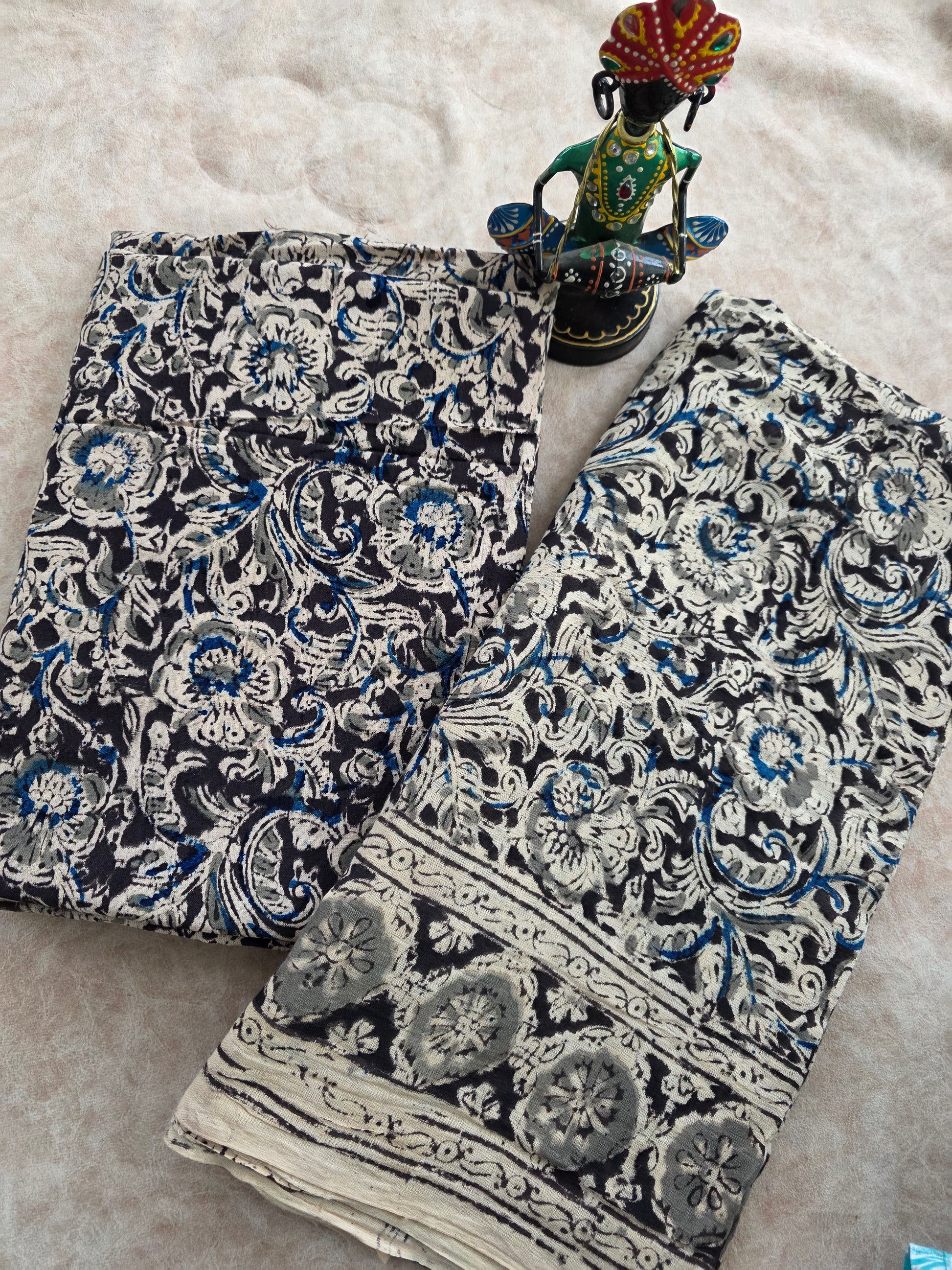 This set includes a top and dupatta made of pure handblock kalamkari cotton, with the dupatta measuring 2.5 meters. Please note that the bottom piece is not included.