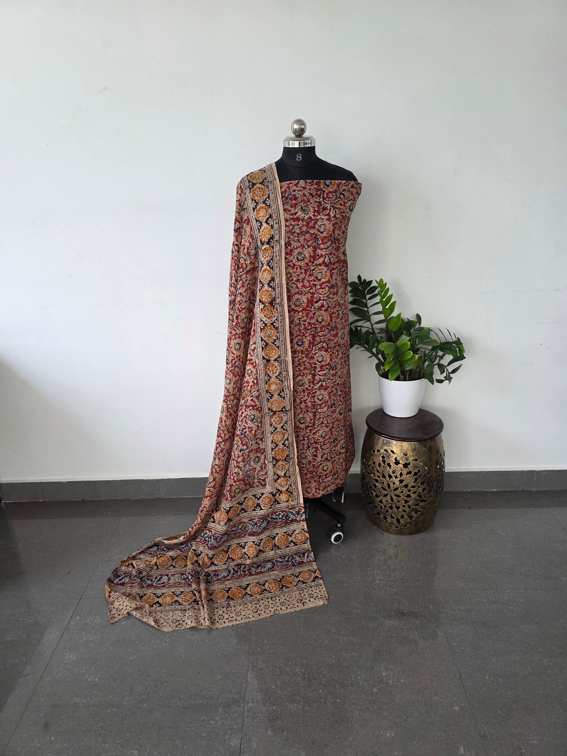 This set includes a top and dupatta made of pure handblock kalamkari cotton, with the dupatta measuring 2.5 meters. Please note that the bottom piece is not included.