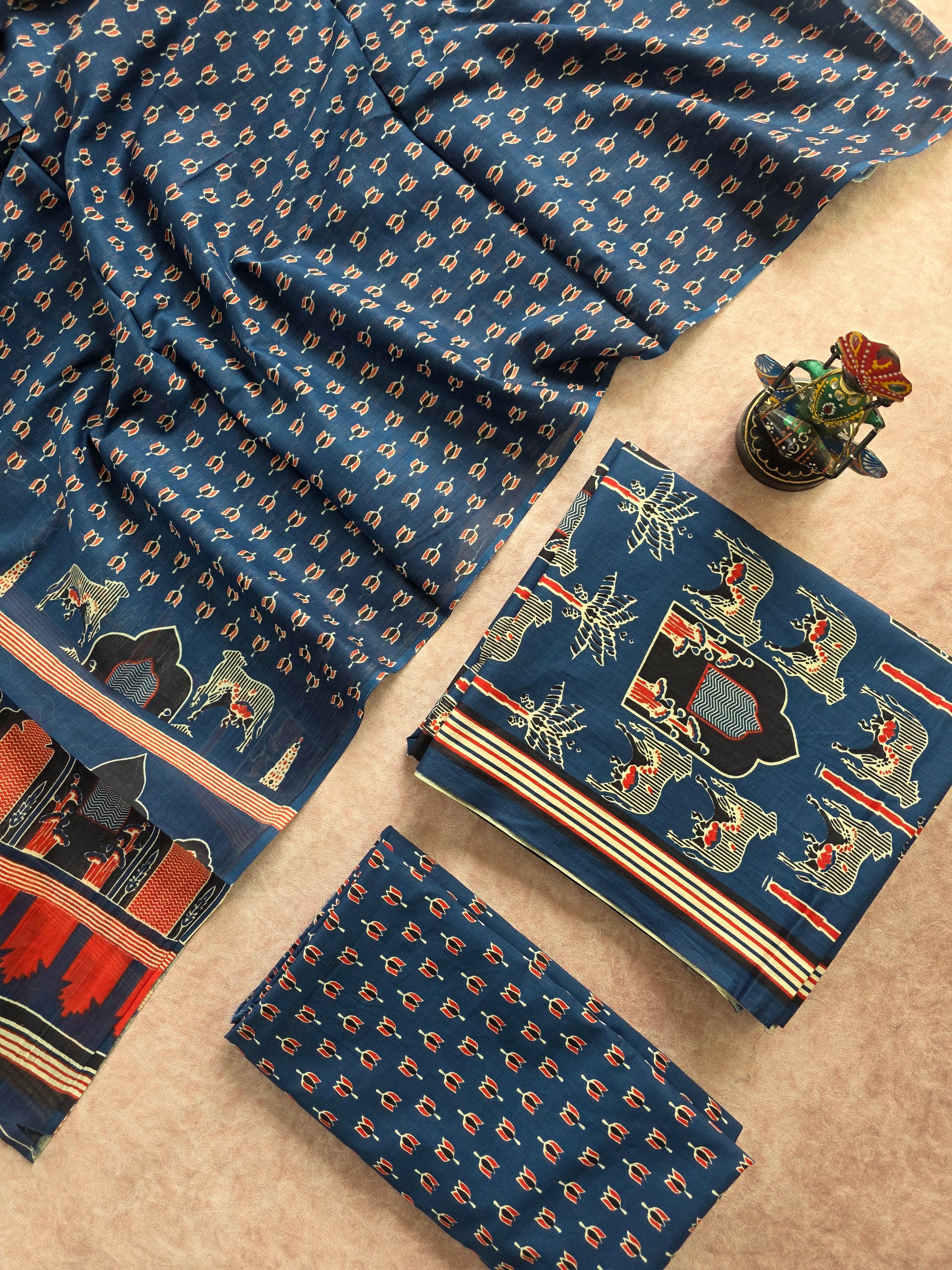 This Jaipuri cotton set features a Jaipur cotton top adorned with an elegant border, paired with a pure Jaipur cotton bottom. The set includes a pure Jaipur cotton shawl as a dupatta. Ideal for everyday use, it requires no additional lining for comfort and style.