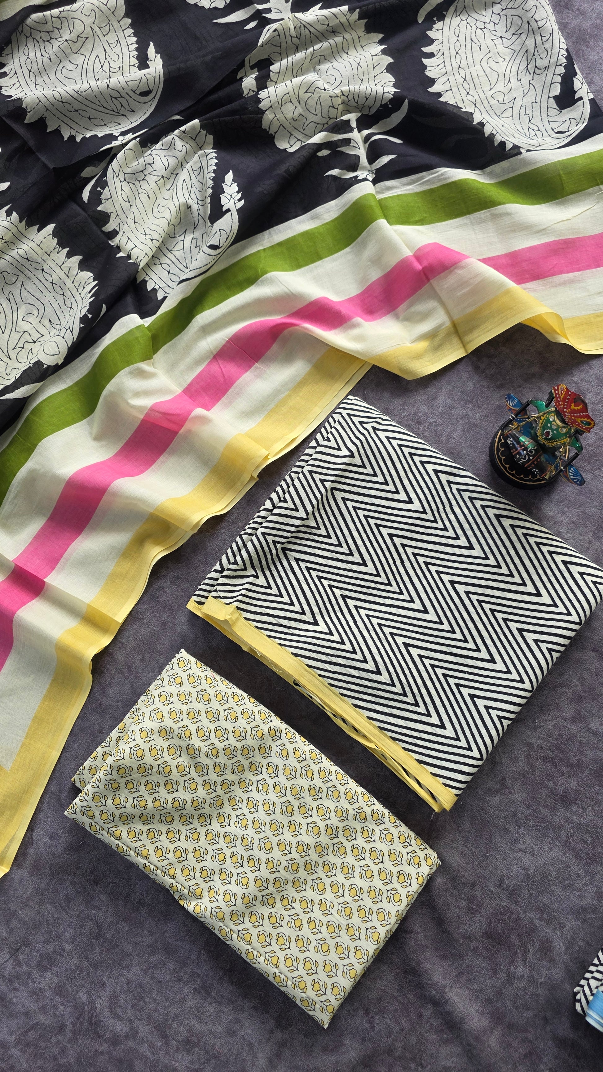 This Jaipuri cotton set features a Jaipur cotton top adorned with an elegant border, paired with a pure Jaipur cotton bottom. The set includes a pure Jaipur cotton shawl as a dupatta. Ideal for everyday use, it requires no additional lining for comfort and style.