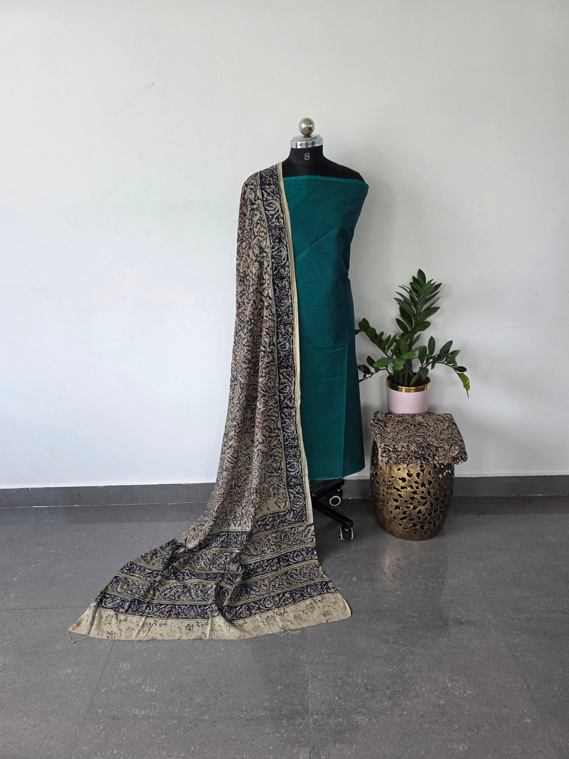 This set includes a handloom cotton top measuring 2.5 meters, paired with a pure soft kalamkari cotton bottom of 2 meters, and a pure soft kalamkari cotton dupatta of 2.25 meters. The kalamkari bottom fabric is versatile enough to be tailored as a top, while the plain top fabric can also be used to create a bottom garment.