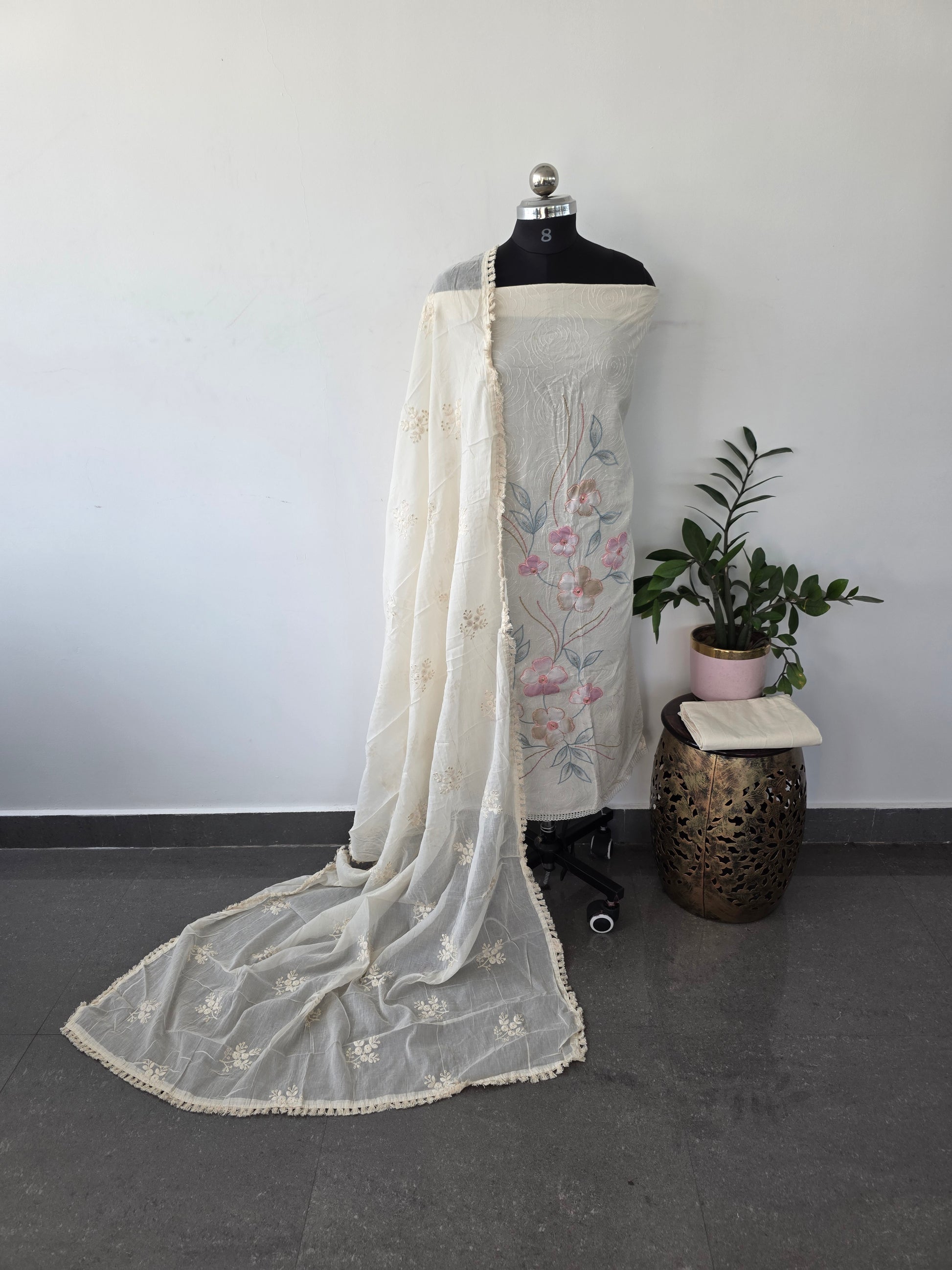 Expertly crafted three-piece ensemble featuring a premium linen-cotton blend top paired with a coordinating duppatta, complemented by a pure cotton bottom. This curated set combines natural fiber comfort with refined construction, ideal for those seeking versatile, breathable wear that transitions seamlessly across occasions.