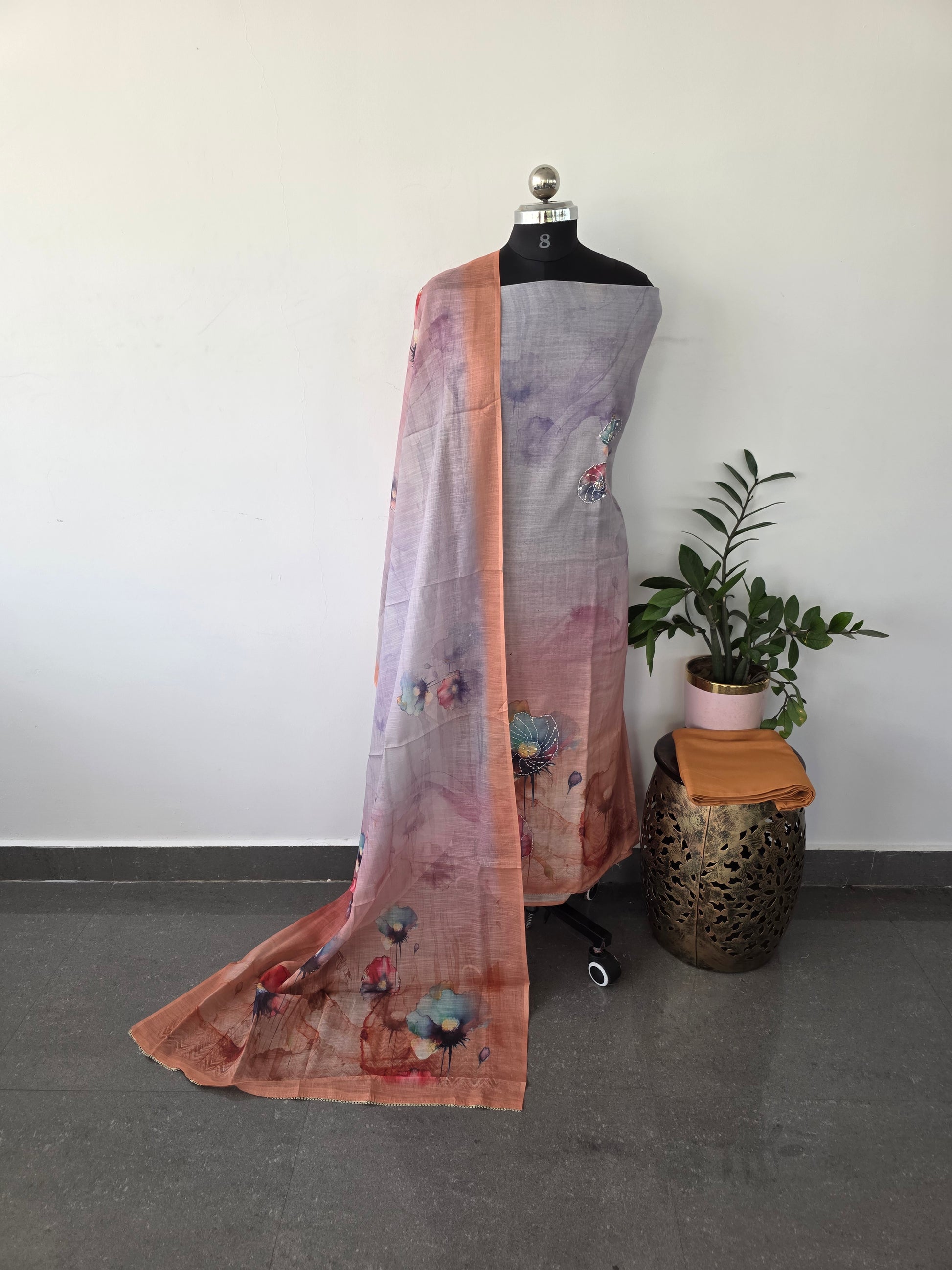 Expertly crafted three-piece ensemble featuring a premium linen-cotton blend top paired with a coordinating duppatta, complemented by a pure cotton bottom. This curated set combines natural fiber comfort with refined construction, ideal for those seeking versatile, breathable wear that transitions seamlessly across occasions.