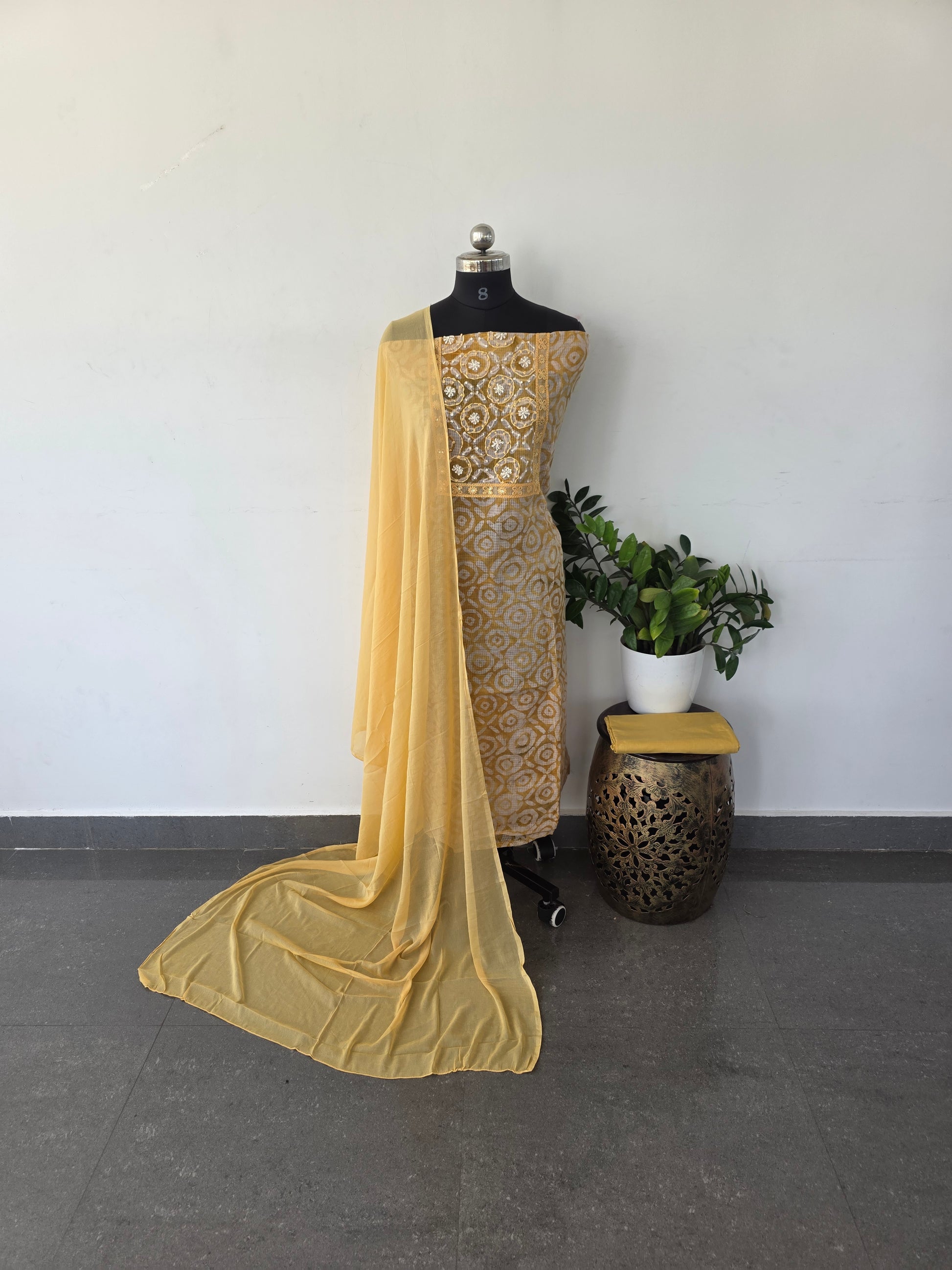 The premium kota set with chiffon shawl features a top with embroidered sequins on the yoke patch, along with a comfortable cotton bottom. A beautiful chiffon shawl is also included to complete the look.