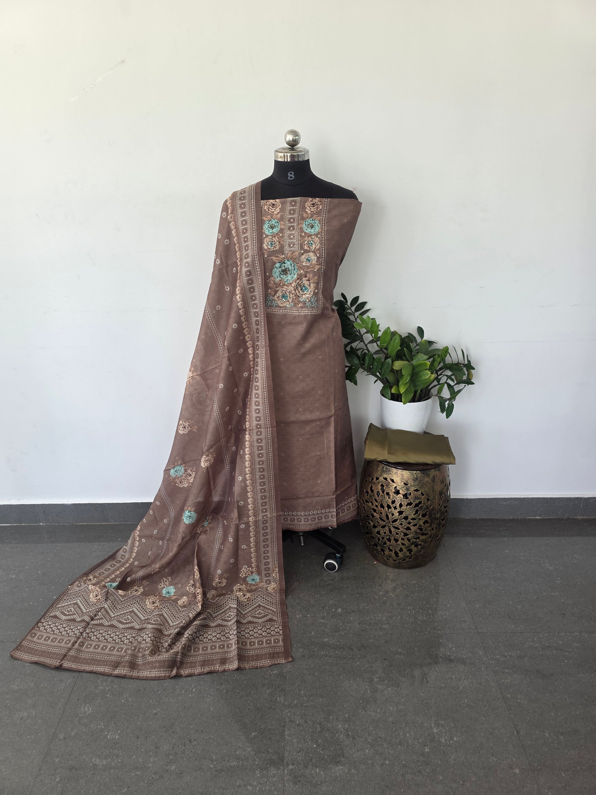 Premium digital chanderi silk top with embroidery sequence yoke, silk bottom, soft digital chanderi silk shawl