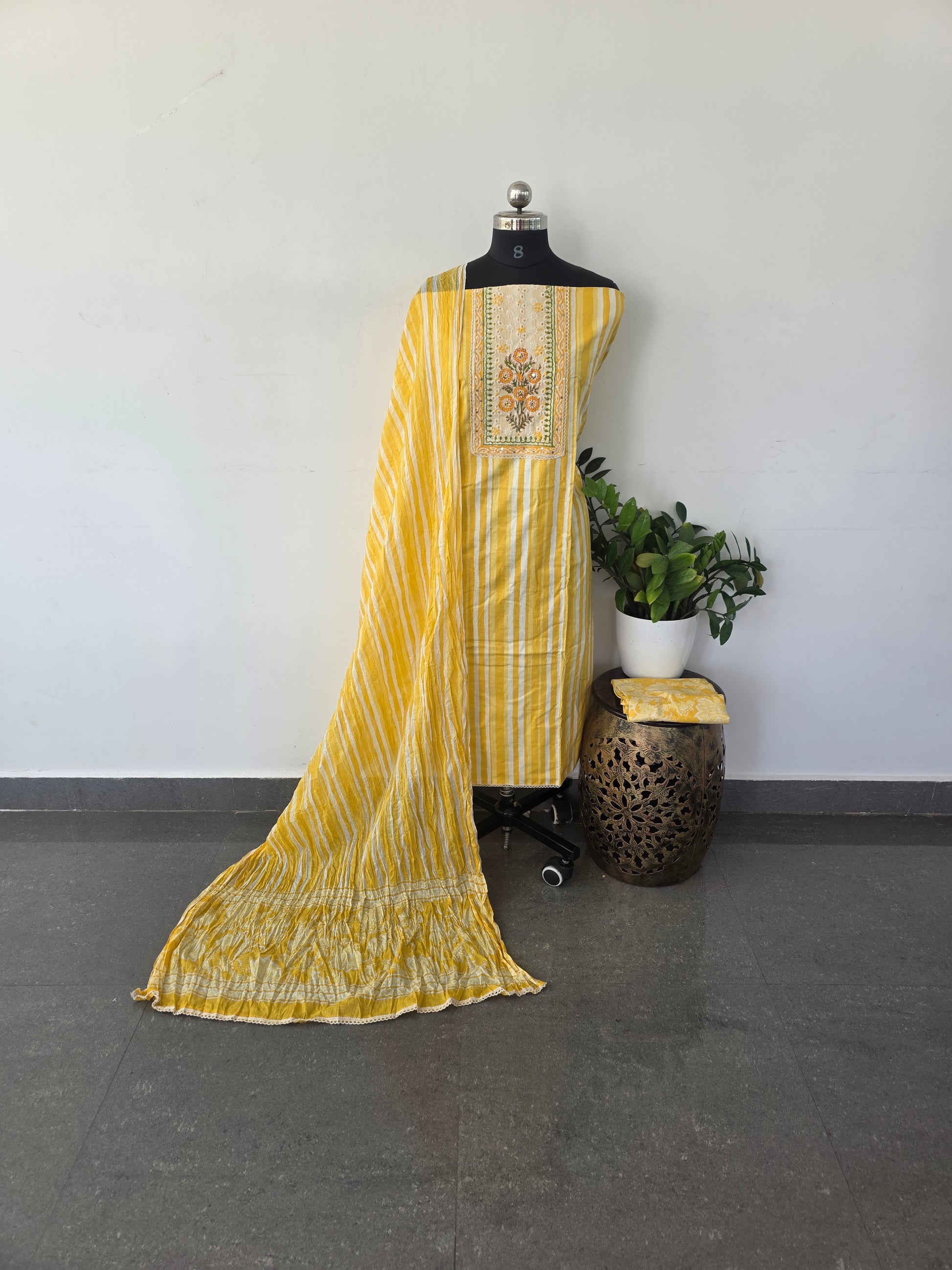 Pure cotton top with block printed embroidery sequence yoke patch, cotton bottom, pure cotton shawl
