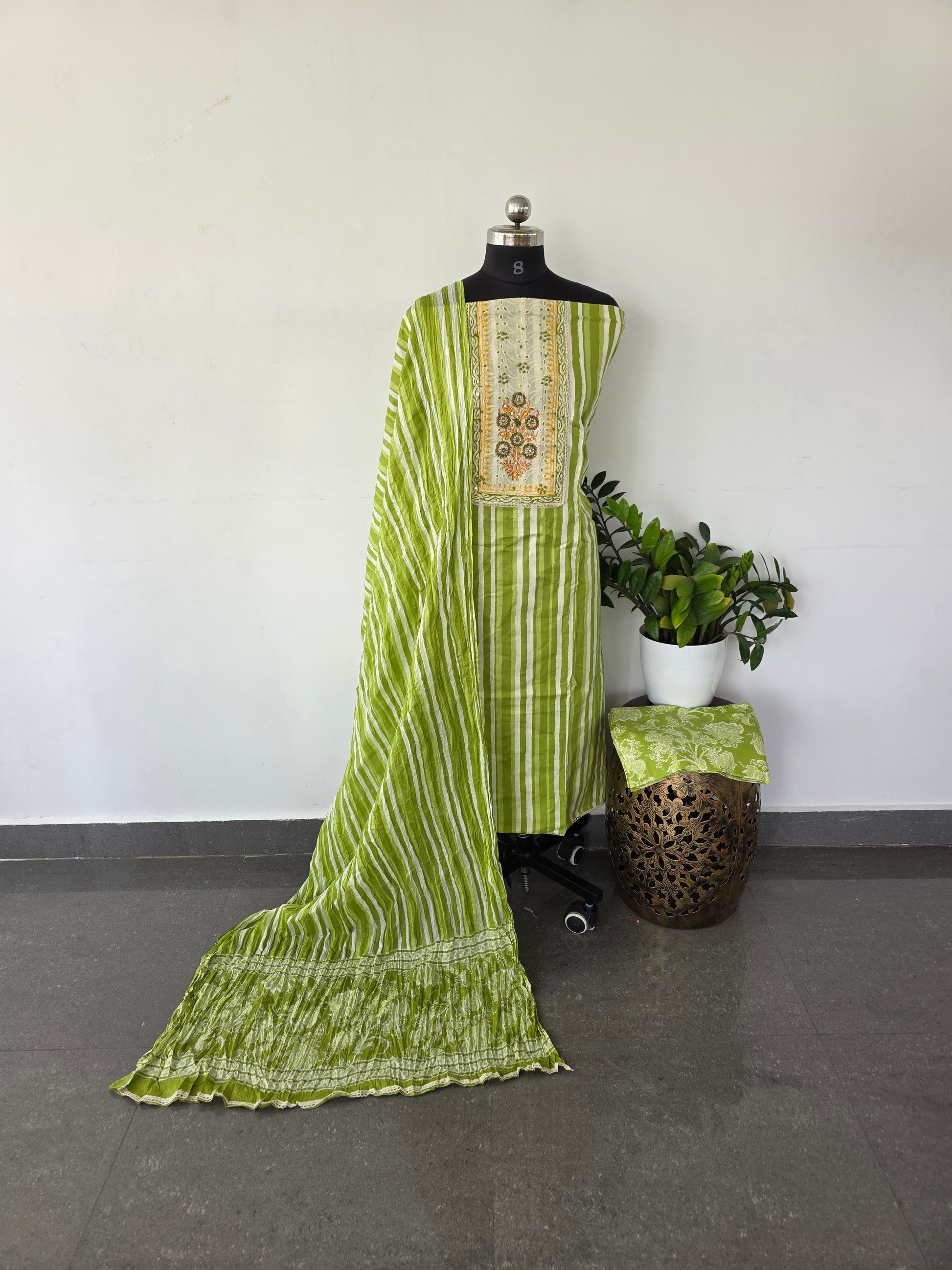 Pure cotton top with block printed embroidery sequence yoke patch, cotton bottom, pure cotton shawl