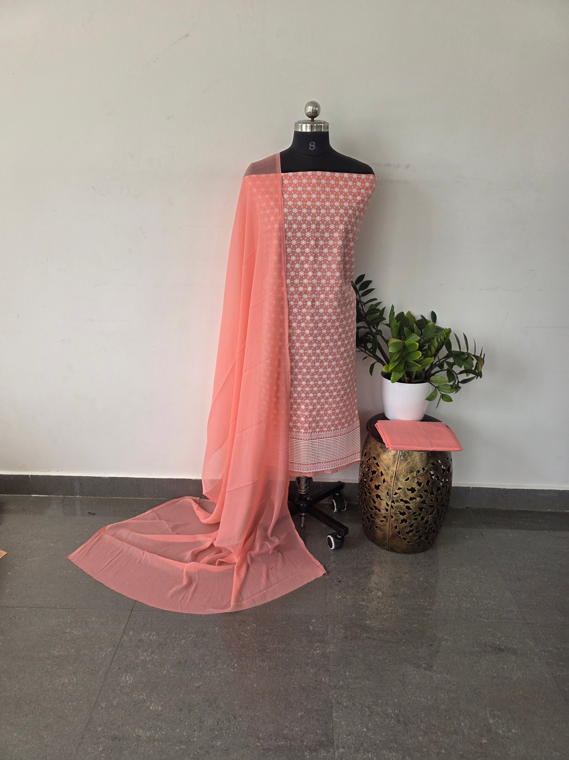Pure cotton top with heavy chikankari work, cotton bottom, chiffon shawl