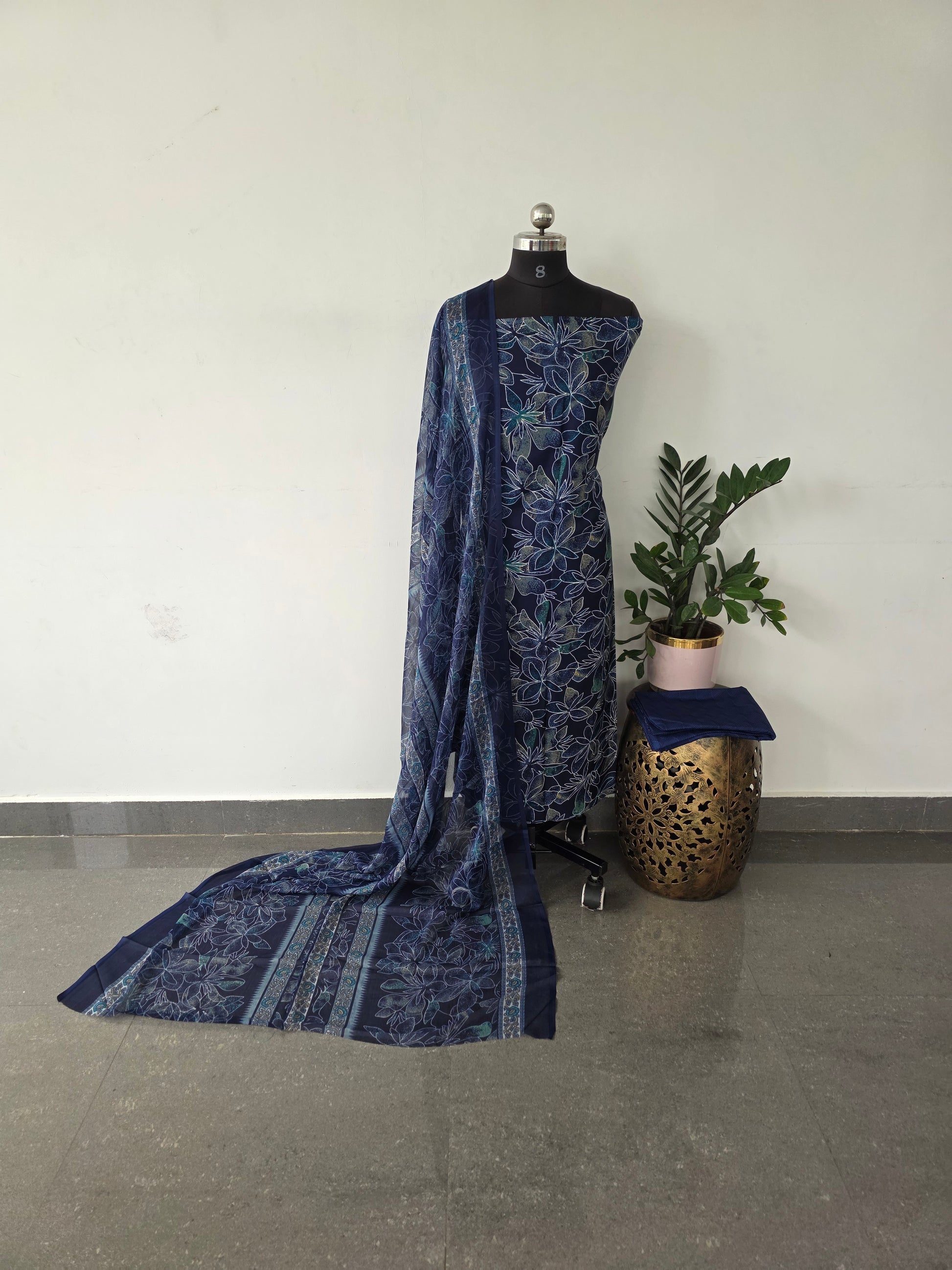 This set includes a premium French crepe top measuring approximately 2.40 meters, paired with a bottom and dupatta each about 2.25 meters in length.