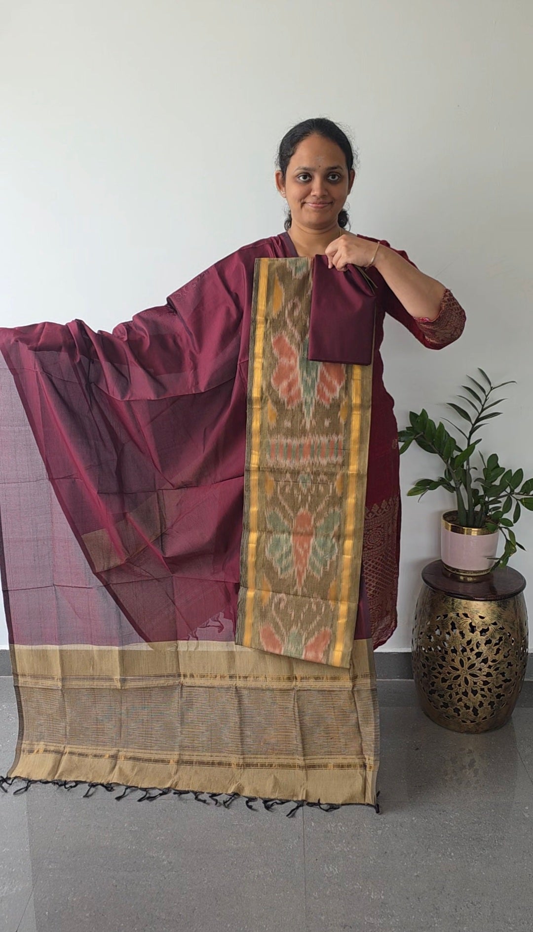 <p>This suit features a top crafted from Pochampally sico silk adorned with ikkat daman, measuring 2.5 meters. The bottom is made of 2 meters of silk fabric. The ensemble is completed with a sico silk shawl dupatta, approximately 2.5 meters long, finished with elegant tassels.</p>