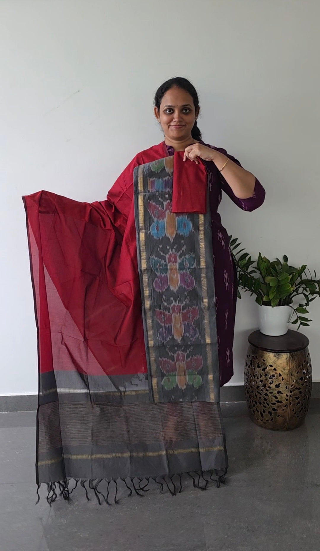 This suit features a top crafted from Pochampally sico silk adorned with ikkat daman, measuring 2.5 meters. The bottom is made of 2 meters of silk fabric. The ensemble is completed with a sico silk shawl dupatta, approximately 2.5 meters long, finished with elegant tassels.