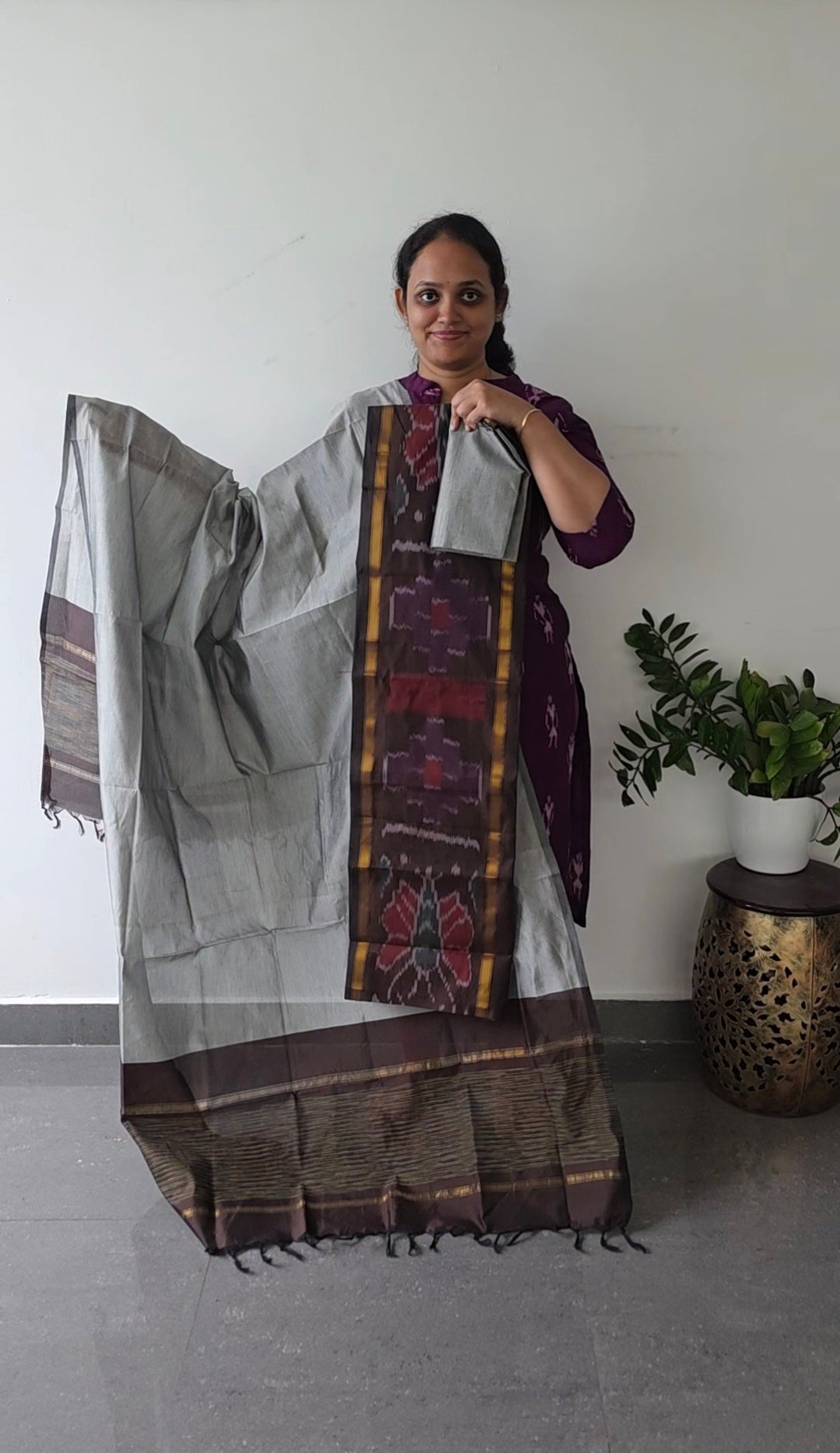 This suit features a top crafted from Pochampally sico silk adorned with ikkat daman, measuring 2.5 meters. The bottom is made of 2 meters of silk fabric. The ensemble is completed with a sico silk shawl dupatta, approximately 2.5 meters long, finished with elegant tassels.