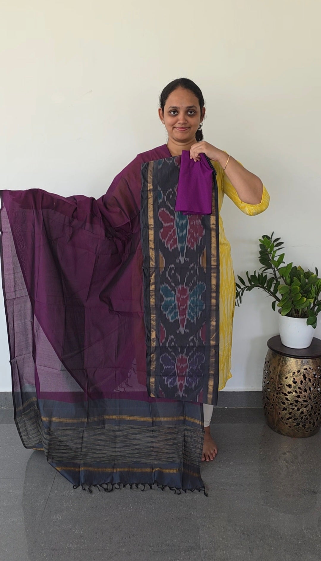 This suit features a top crafted from Pochampally sico silk adorned with ikkat daman, measuring 2.5 meters. The bottom is made of 2 meters of silk fabric. The ensemble is completed with a sico silk shawl dupatta, approximately 2.5 meters long, finished with elegant tassels.