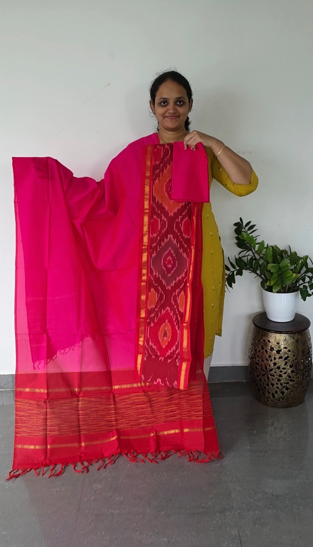 This set features a Pochampally sico top adorned with an allover ikkat weave (2.5 meters), paired with a 2-meter silk bottom. The ensemble is completed by a 2.5-meter sico silk dupatta with decorative tassels.