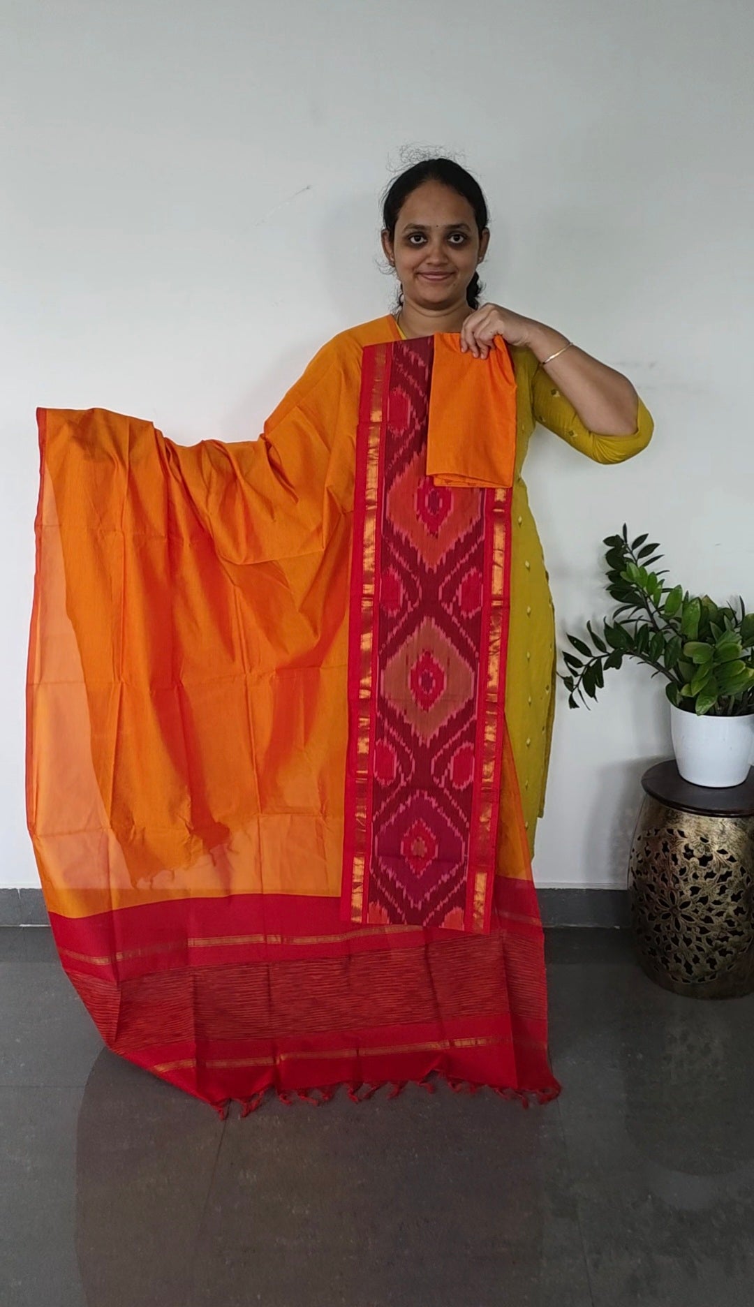 This set features a Pochampally sico top adorned with an allover ikkat weave (2.5 meters), paired with a 2-meter silk bottom. The ensemble is completed by a 2.5-meter sico silk dupatta with decorative tassels.