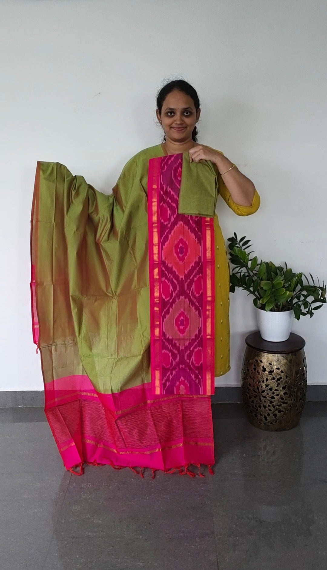 This set features a Pochampally sico top adorned with an allover ikkat weave (2.5 meters), paired with a 2-meter silk bottom. The ensemble is completed by a 2.5-meter sico silk dupatta with decorative tassels.