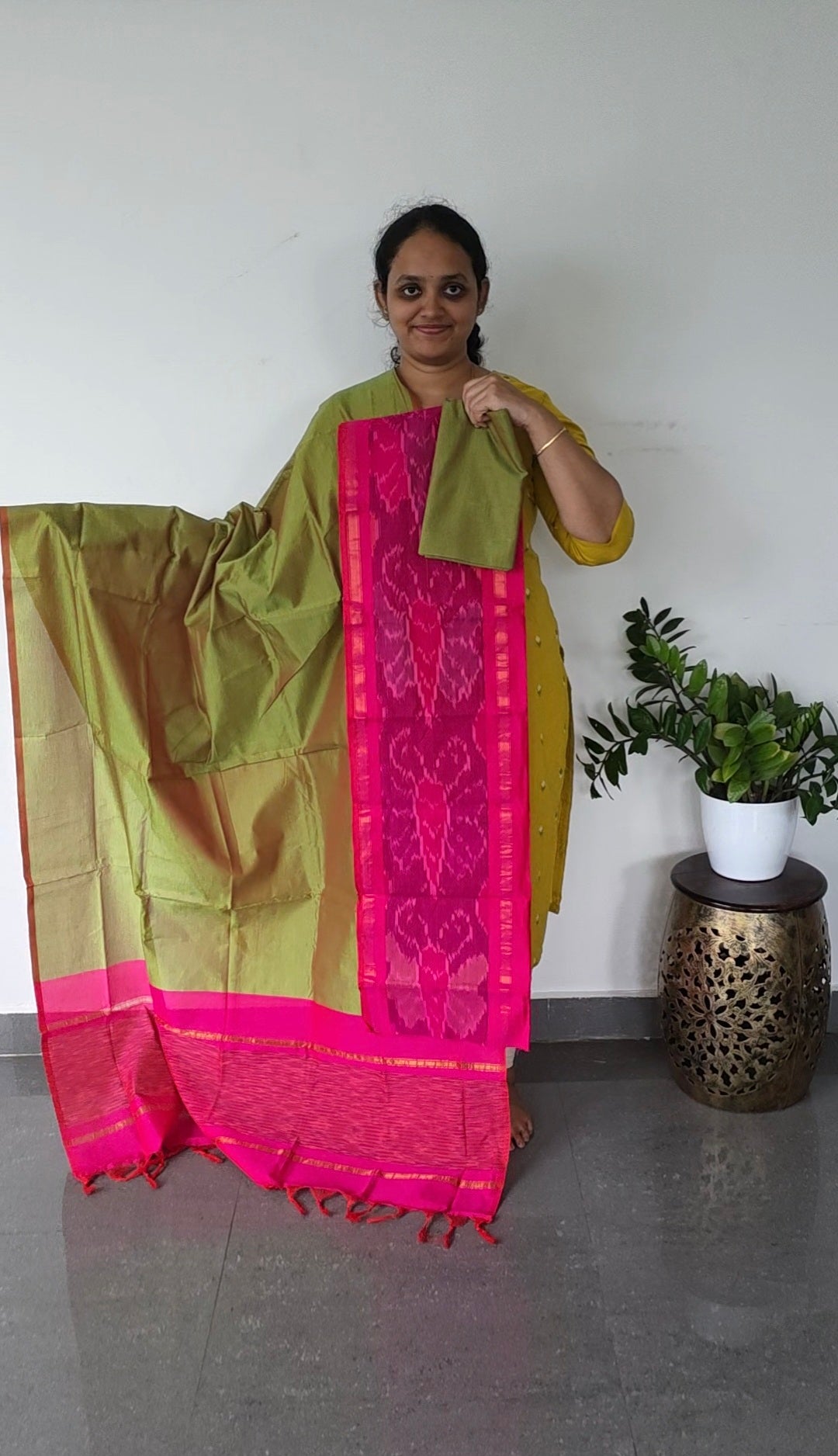 This set features a Pochampally sico top adorned with an allover ikkat weave (2.5 meters), paired with a 2-meter silk bottom. The ensemble is completed by a 2.5-meter sico silk dupatta with decorative tassels.