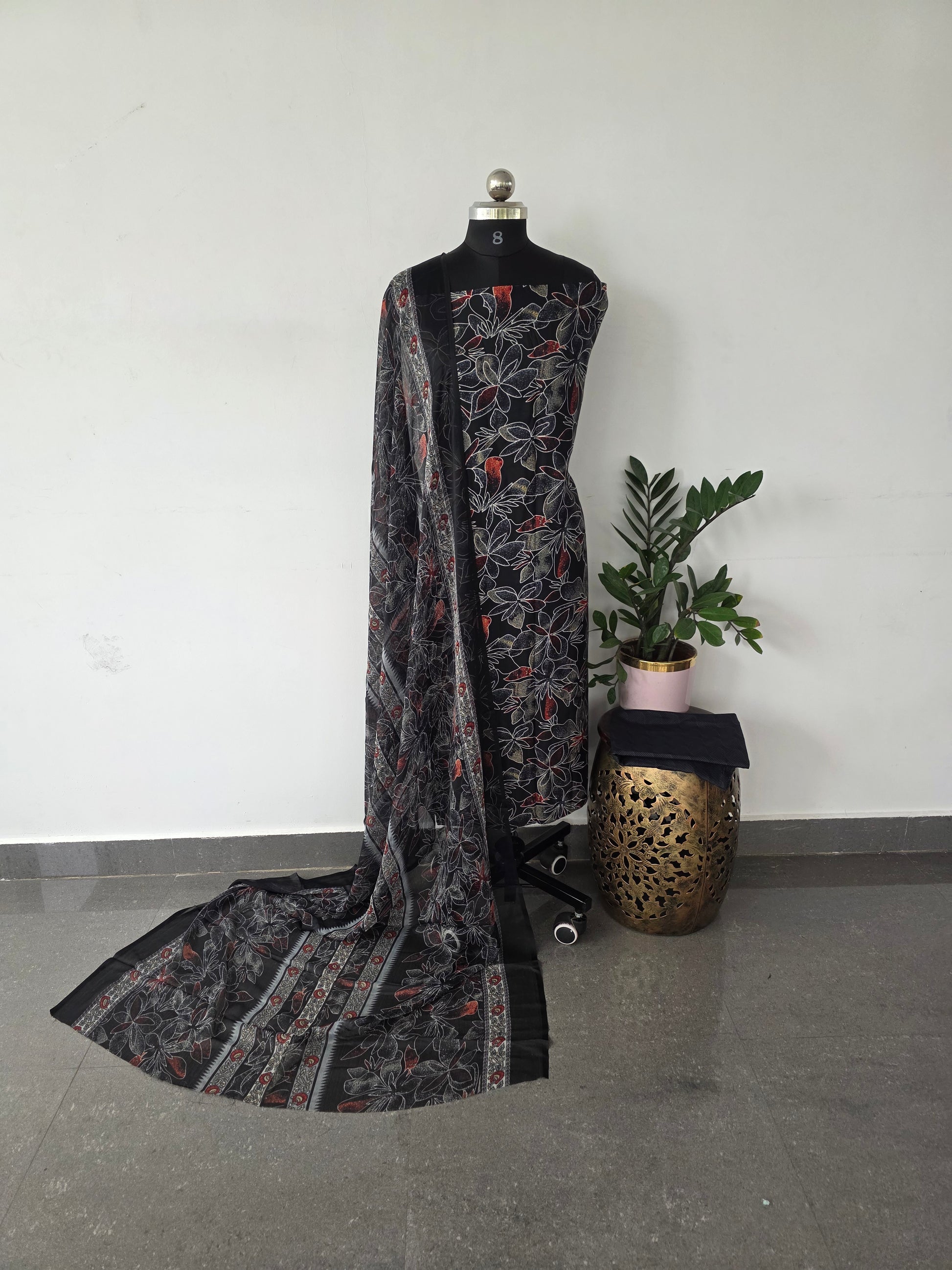 This set includes a premium French crepe top measuring approximately 2.40 meters, paired with a bottom and dupatta each about 2.25 meters in length.