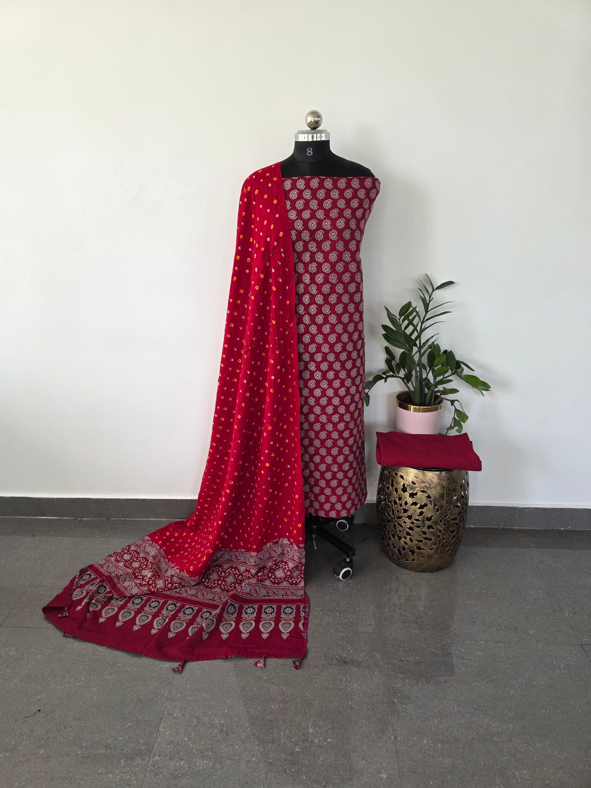 Discover this curated ensemble featuring a refined ajrakh cotton top paired with a cotton bottom and coordinating duppatta. The collection culminates in a striking pure bandhani cotton shawl, adorned with an intricate ajrakh patch and finished with traditional tassels for authentic handloom elegance.