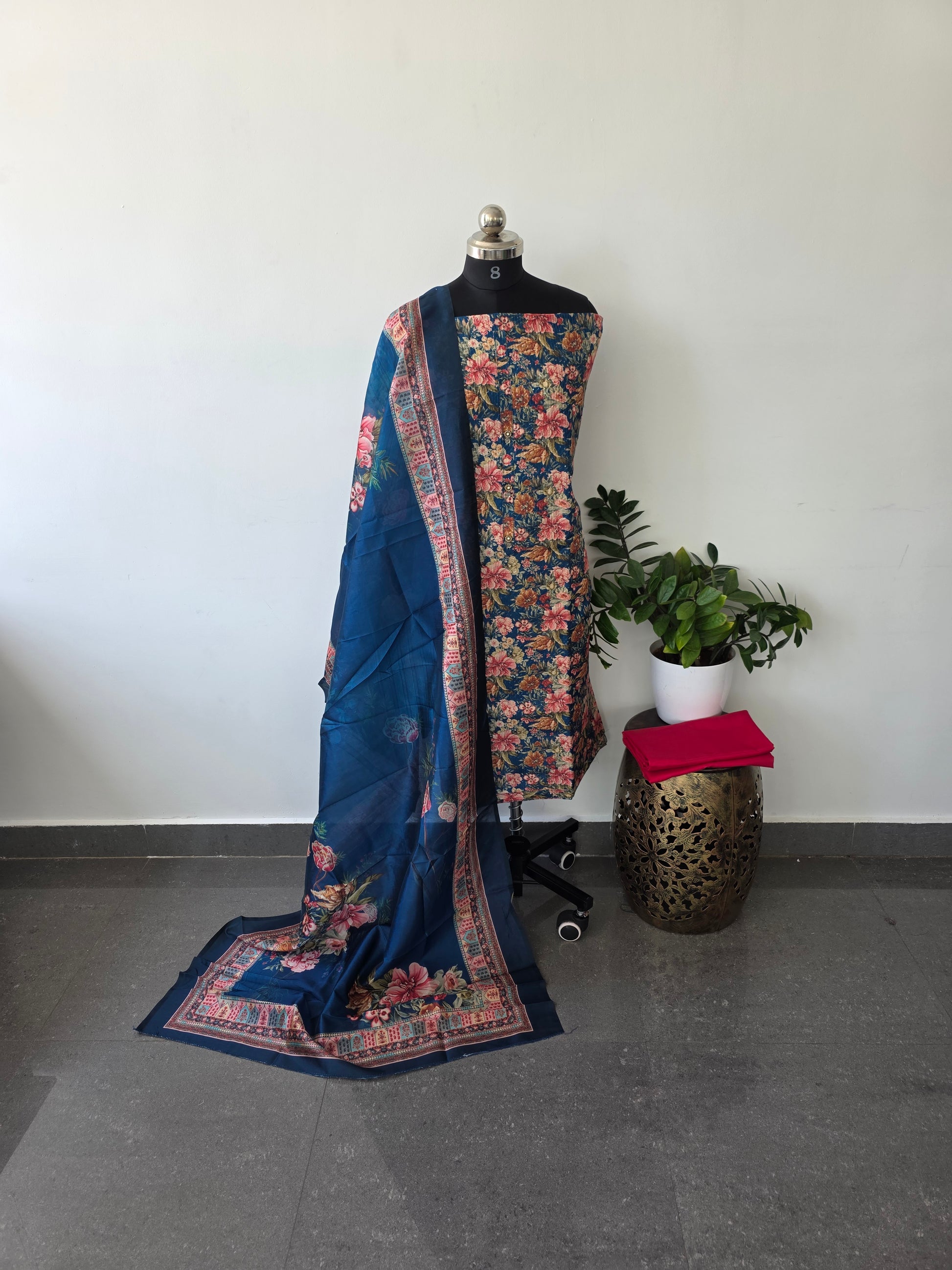 The top is crafted from digital silk adorned with jumki embroidery, complemented by a silk dupatta featuring a digitally printed shawl design.