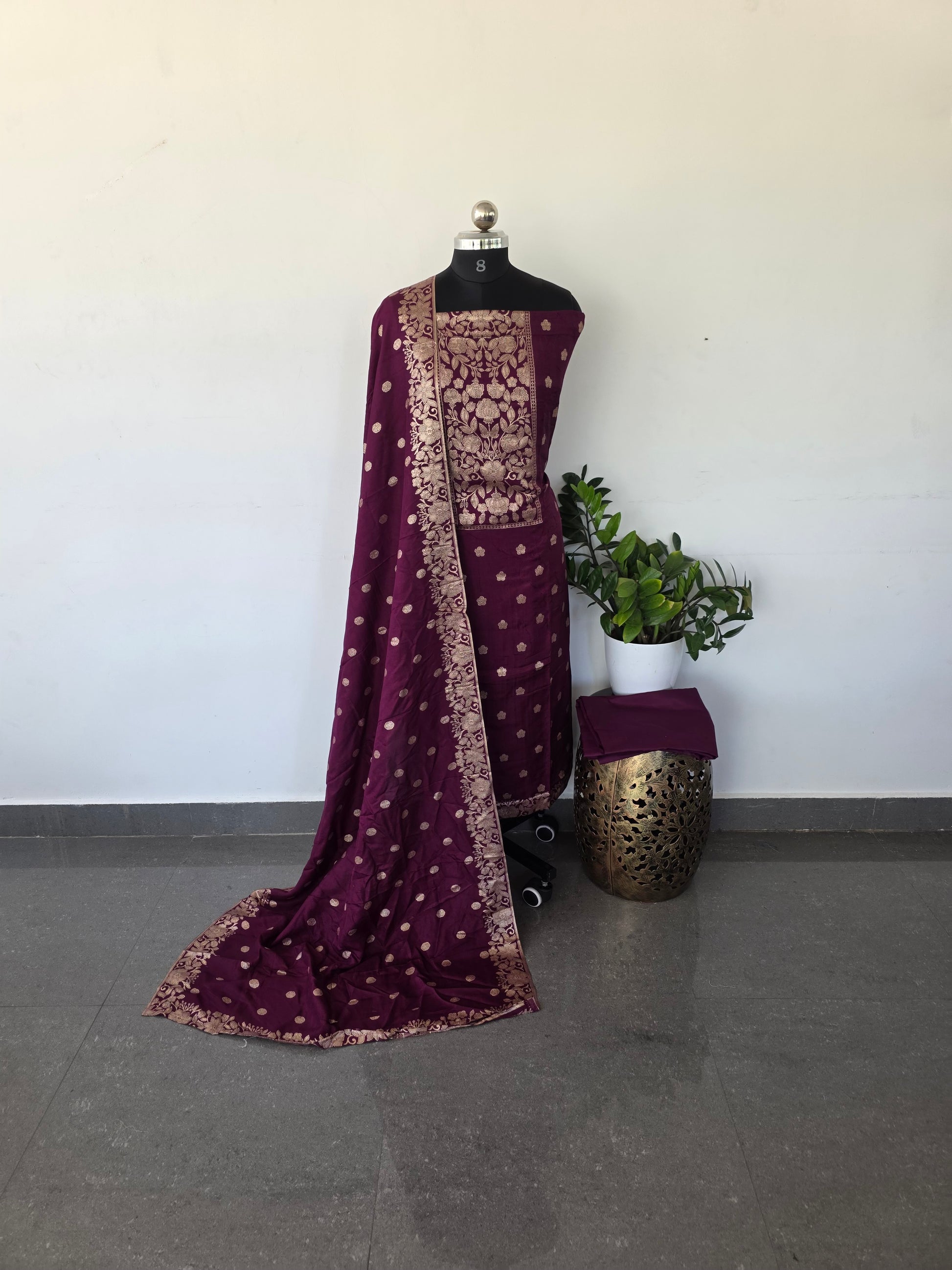Premium soft dola silk top featuring an intricate jacquard weave on the yoke and lower body. Complemented by a silk dupatta and a premium soft dola silk shawl, both adorned with detailed jacquard borders for an elegant finish.