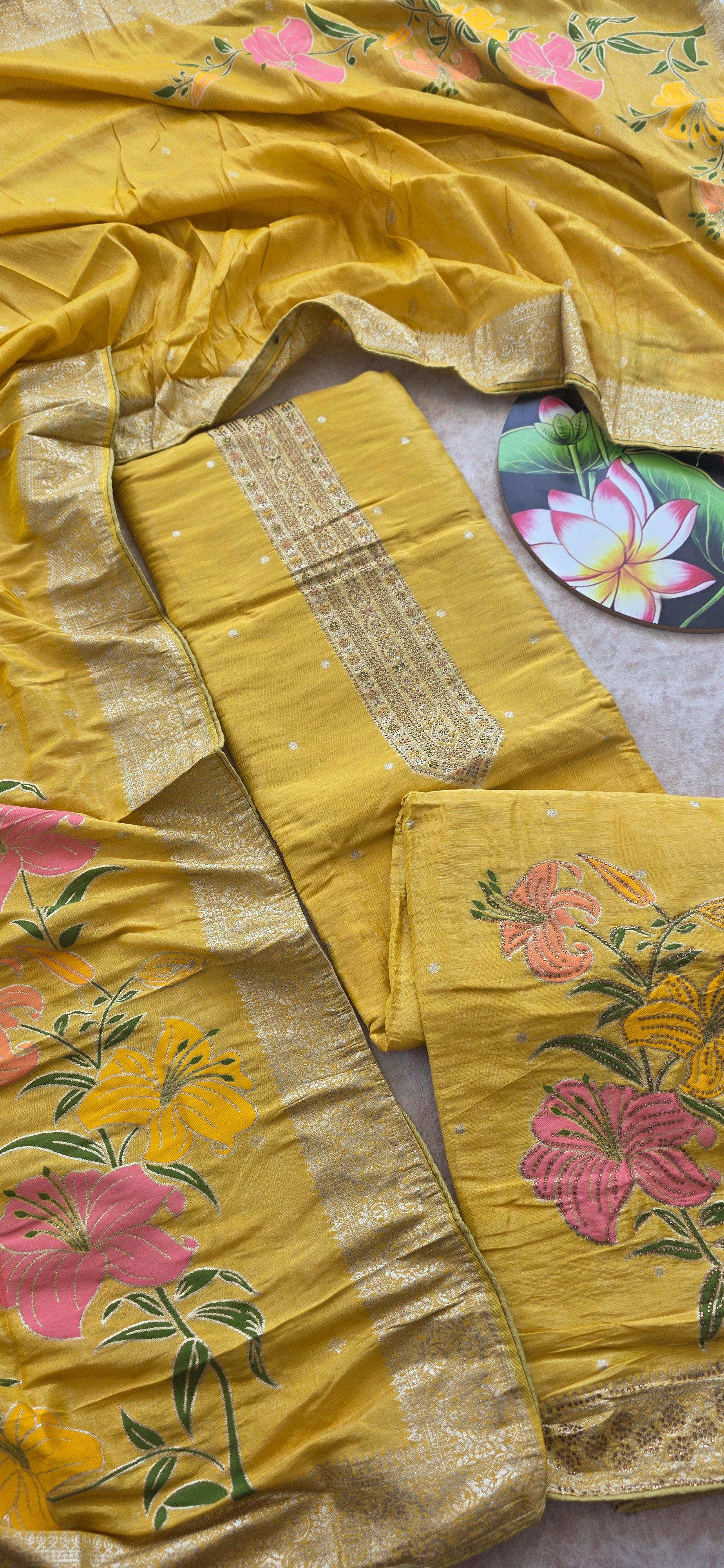 This set features a premium fancy shimmer silk top adorned with a yoke patch showcasing butta weaving and subtle stone embellishments. The ensemble is completed with a silk bottom and a luxurious soft silk dupatta, richly woven for an elegant finish.