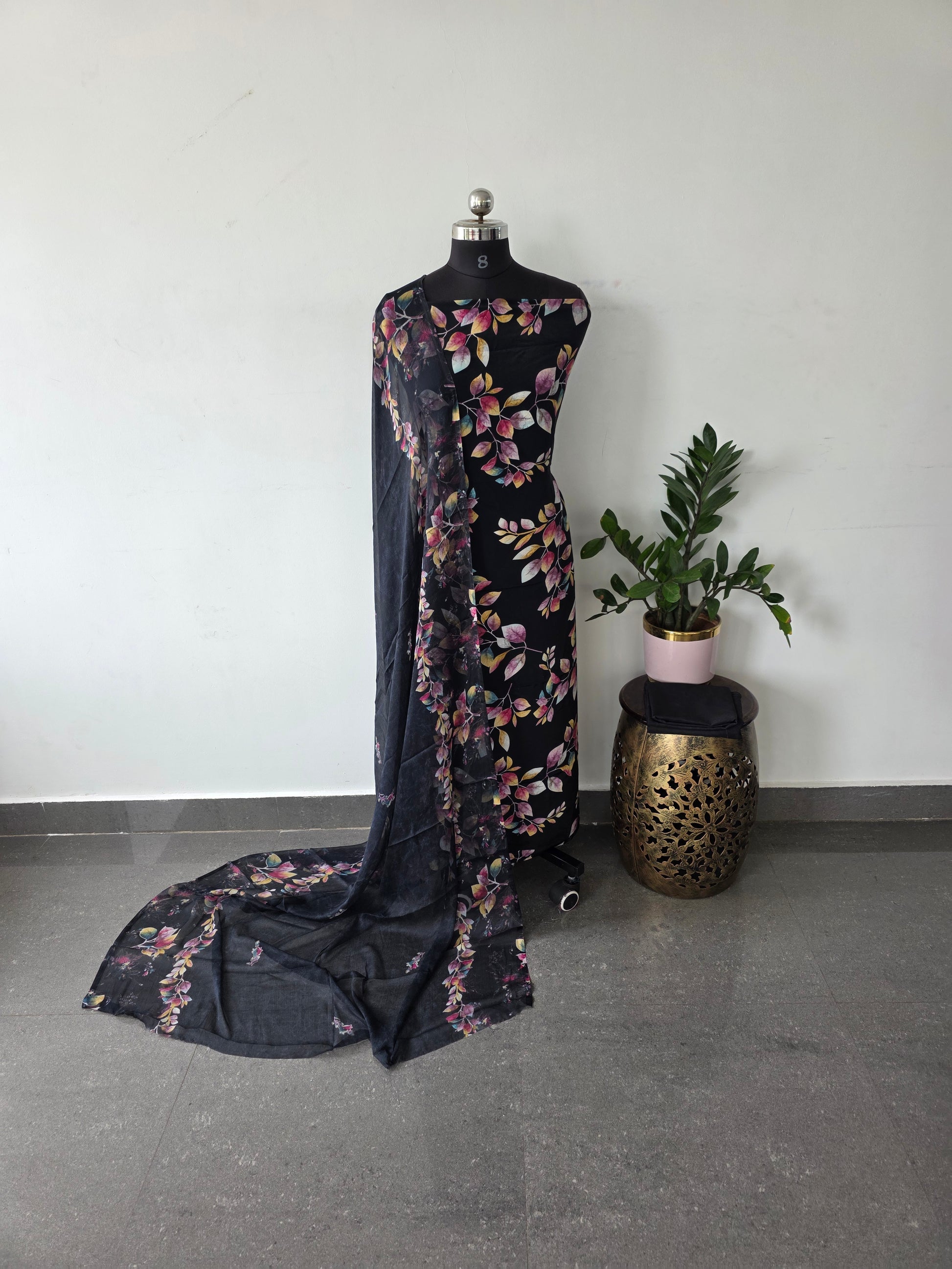 This set includes a premium French crepe top measuring approximately 2.40 meters, paired with a bottom and dupatta each about 2.25 meters in length.