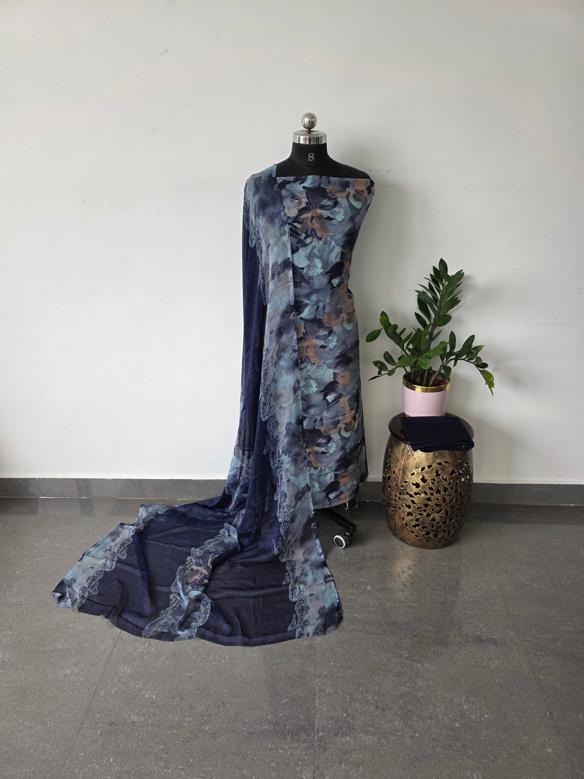 This set includes a premium French crepe top measuring approximately 2.40 meters, paired with a bottom and dupatta each about 2.25 meters in length.