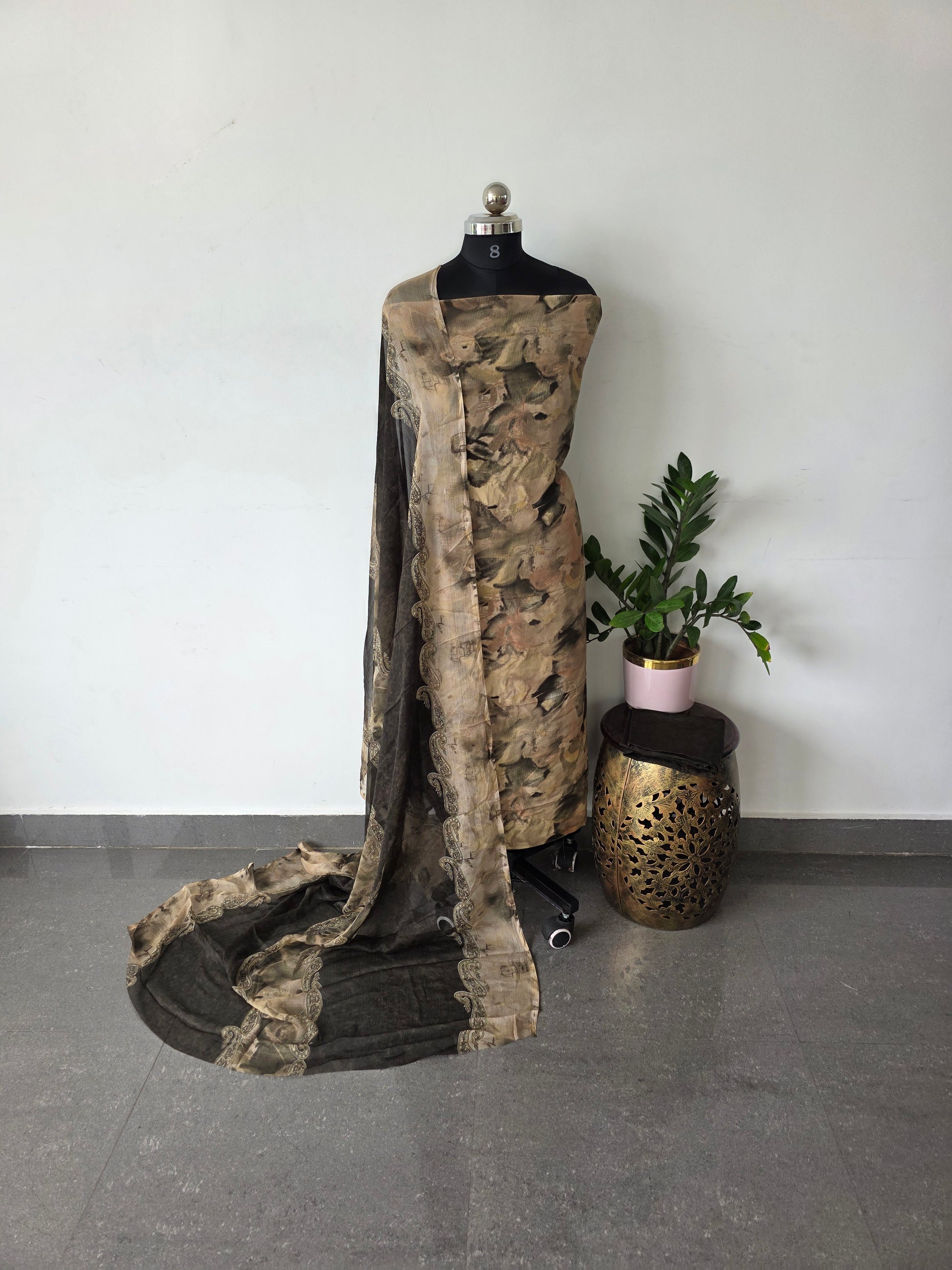 This set includes a premium French crepe top measuring approximately 2.40 meters, paired with a bottom and dupatta each about 2.25 meters in length.