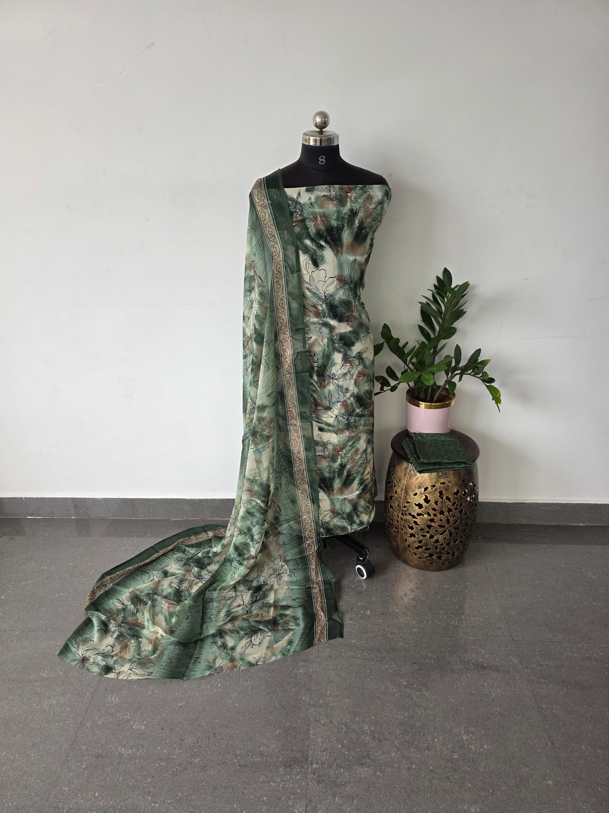 This set includes a premium French crepe top measuring approximately 2.40 meters, paired with a bottom and dupatta each about 2.25 meters in length.