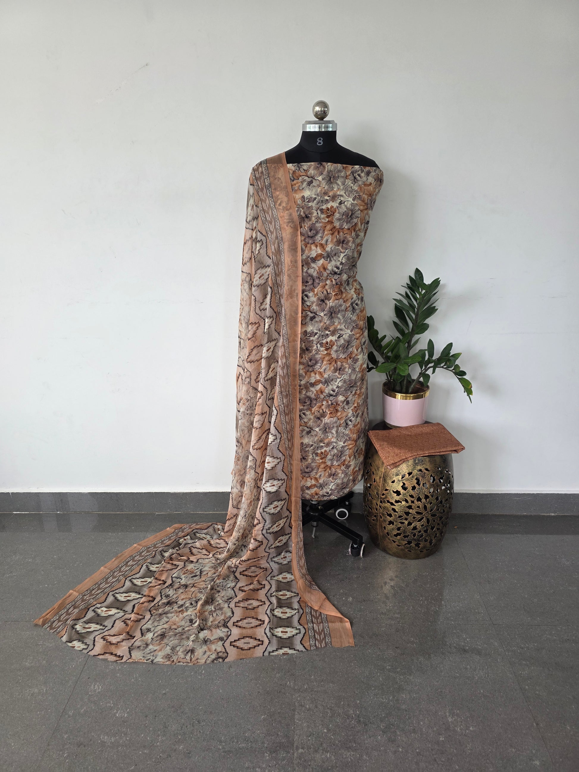 This set includes a premium French crepe top measuring approximately 2.40 meters, paired with a bottom and dupatta each about 2.25 meters in length.