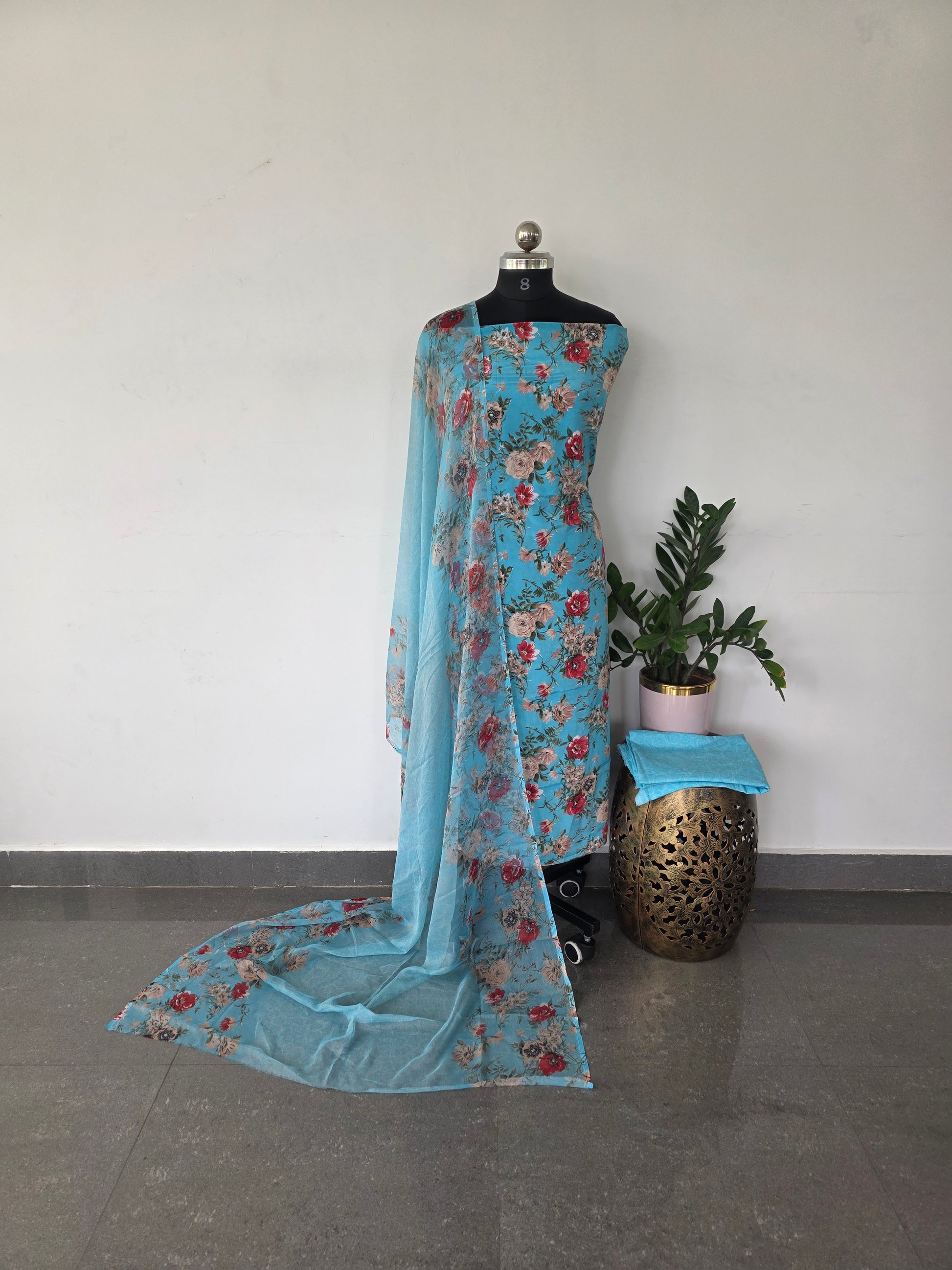 This set includes a premium French crepe top measuring approximately 2.40 meters, paired with a bottom and dupatta each about 2.25 meters in length.