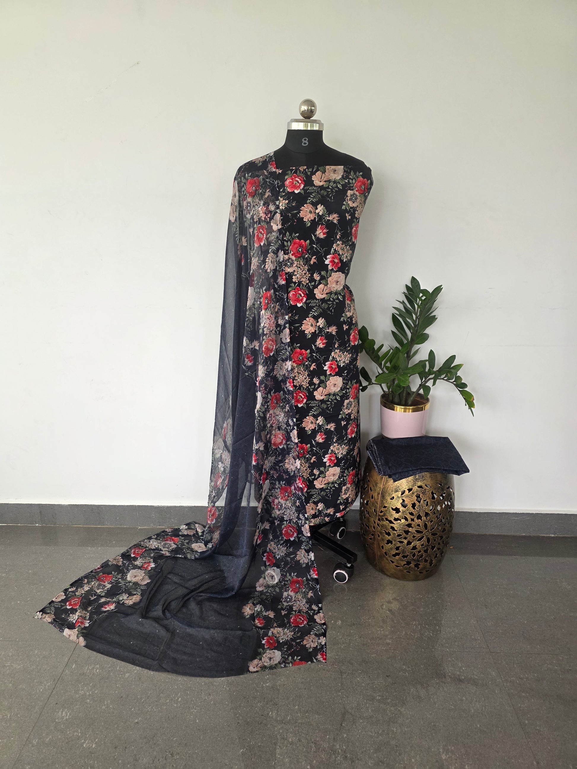 This set includes a premium French crepe top measuring approximately 2.40 meters, paired with a bottom and dupatta each about 2.25 meters in length.