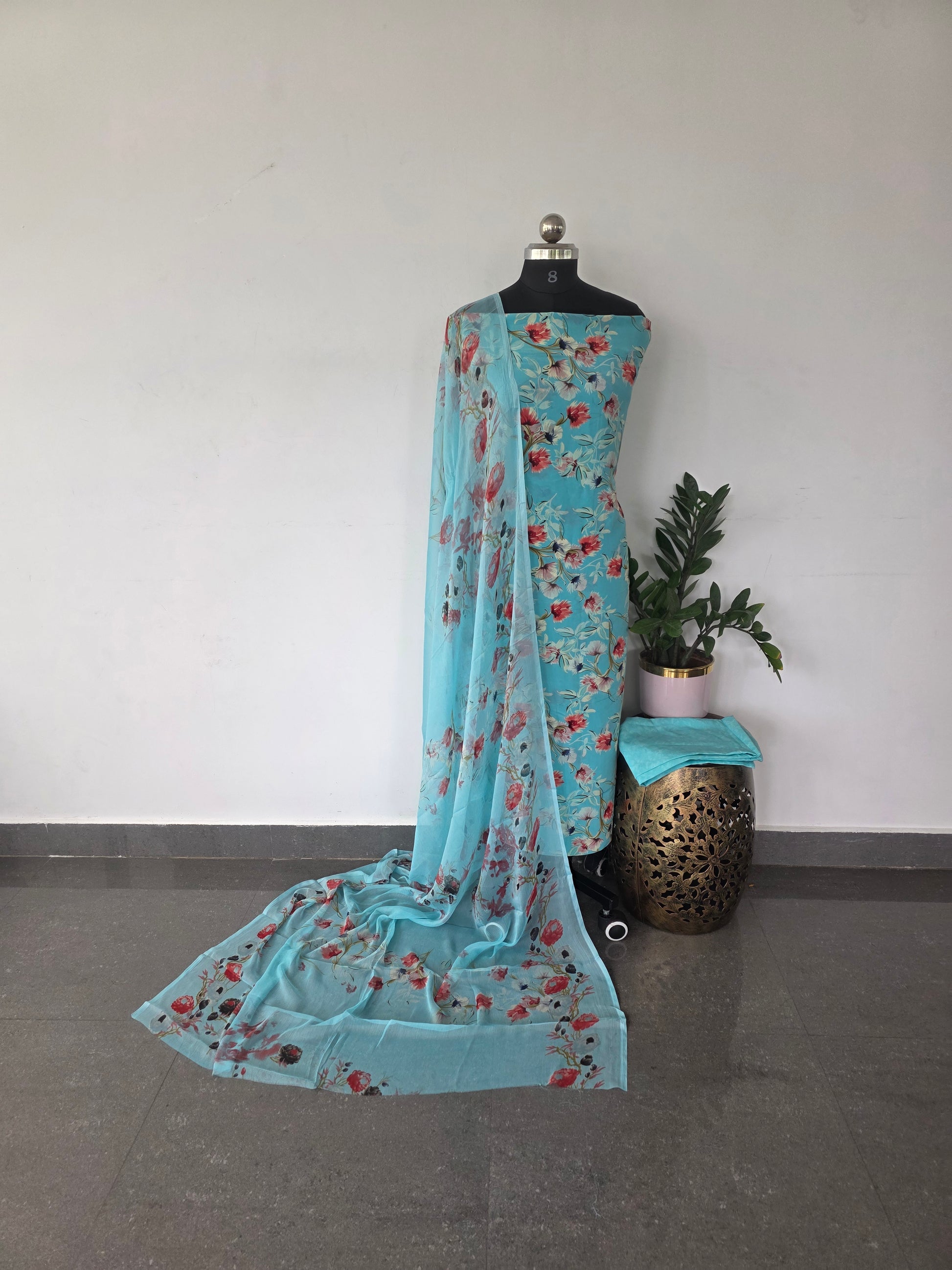 This set includes a premium French crepe top measuring approximately 2.40 meters, paired with a bottom and dupatta each about 2.25 meters in length.