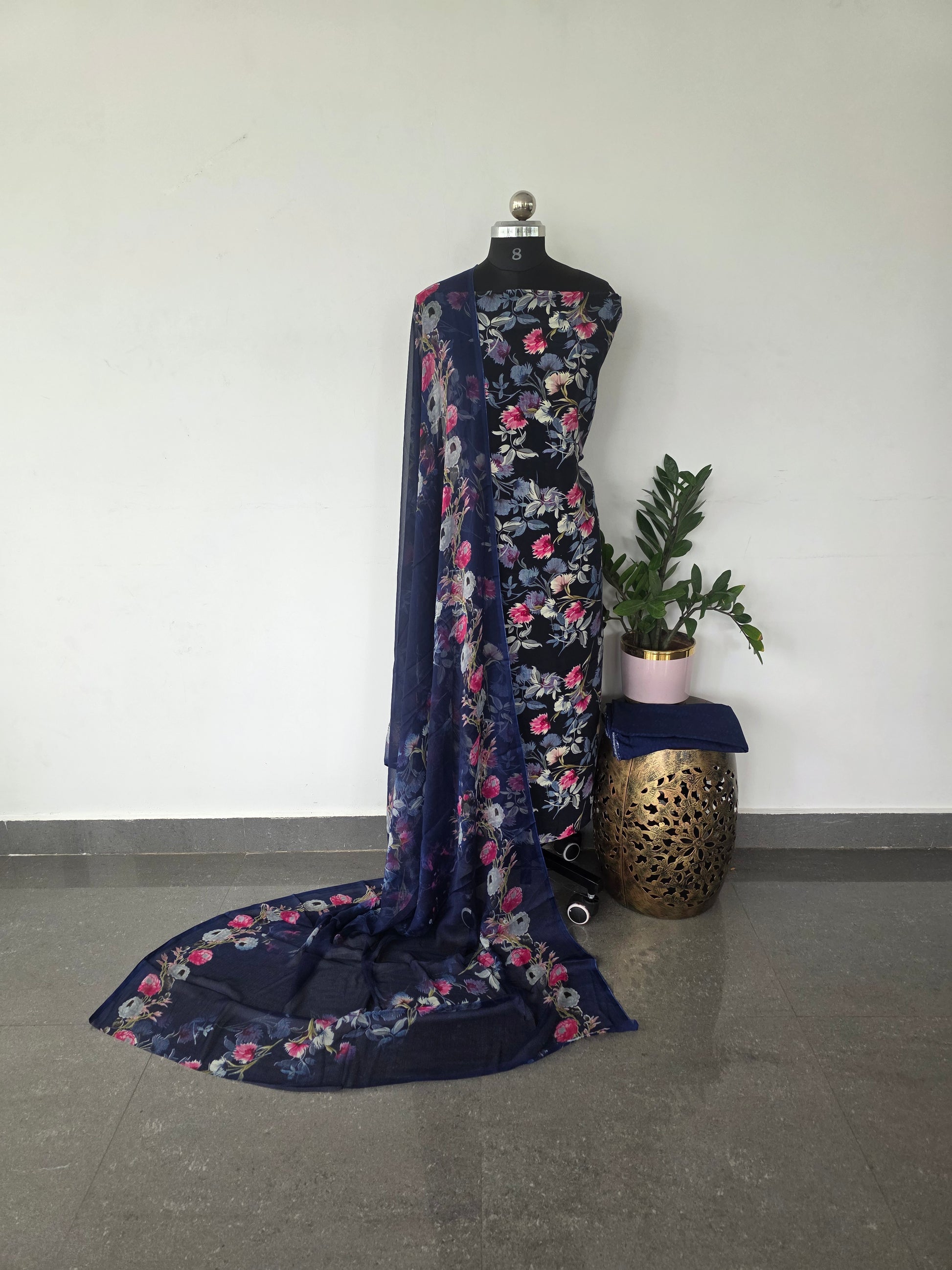 This set includes a premium French crepe top measuring approximately 2.40 meters, paired with a bottom and dupatta each about 2.25 meters in length.