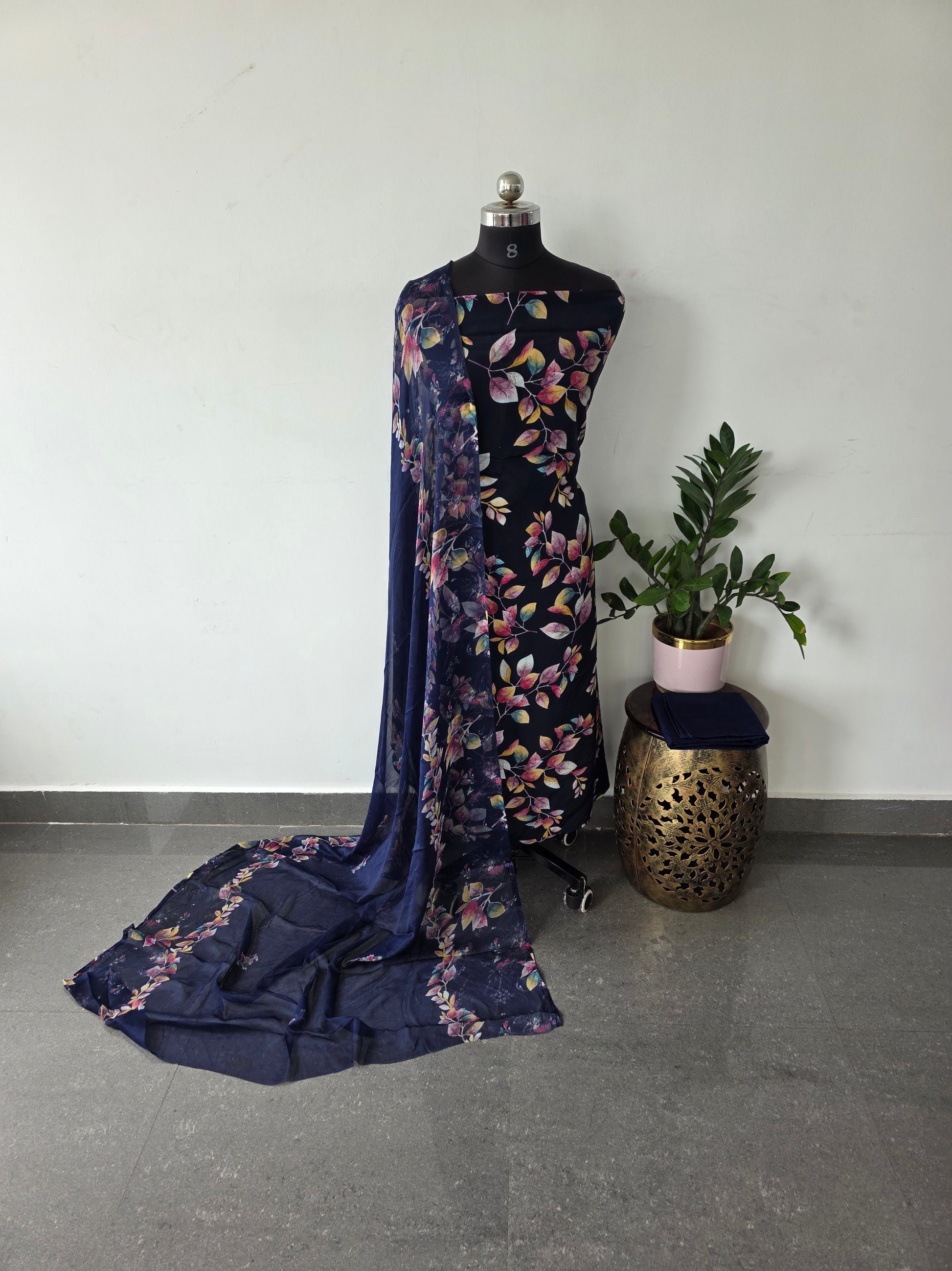 This set includes a premium French crepe top measuring approximately 2.40 meters, paired with a bottom and dupatta each about 2.25 meters in length.