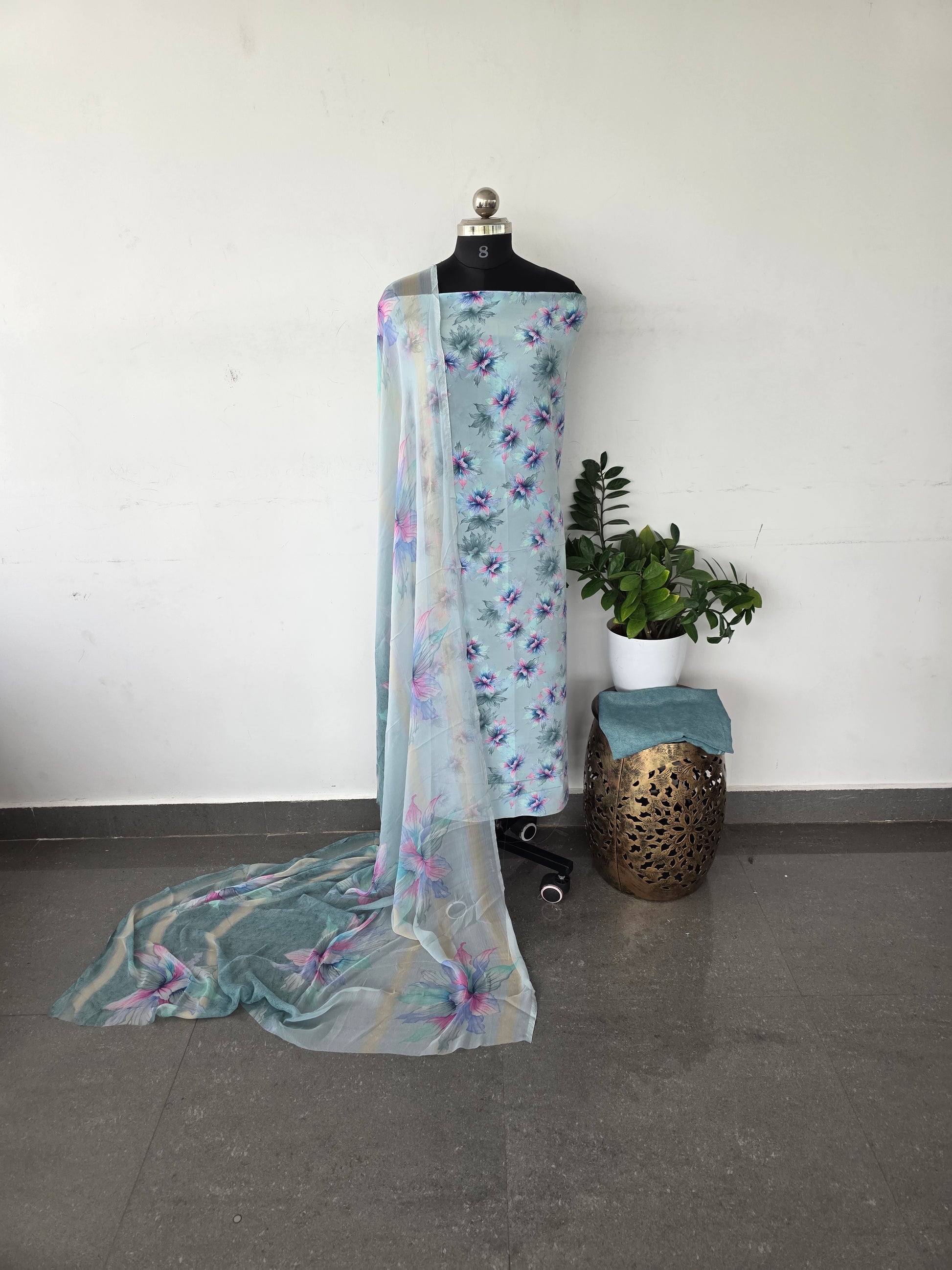 This set includes a premium French crepe top measuring approximately 2.40 meters, paired with a bottom and dupatta each about 2.25 meters in length.